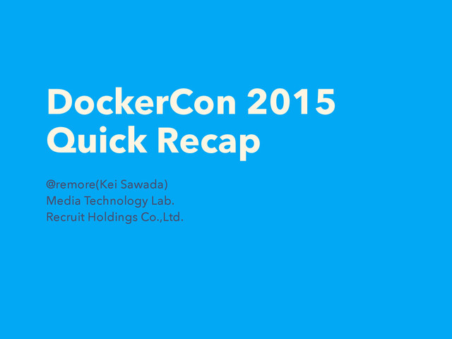 Docker blog. And Timetable of DockerCon 2015 will be a good index for this. • Timetable: https://dockercon2015.sched.org • Official Docker blog: http://blog.docker.com/category/community/ dockercon-2/ • Creationline,inc. is publishing conference report.(Sorry looks like only Japanese version is available) • http://www.creationline.com/lab/docker/10641 • http://www.creationline.com/lab/docker/10662 • (more contents will be uploaded soon)