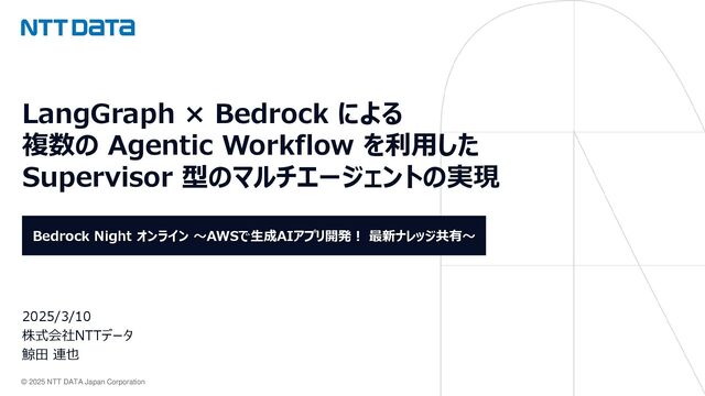複数の Agentic Workflow を利用した Supervisor 型のマルチエージェントの実現 2025/3/10 株式会社NTTデータ 鯨田 連也 Bedrock Night オンライン 〜AWSで生成AIアプリ開発! 最新ナレッジ共有〜