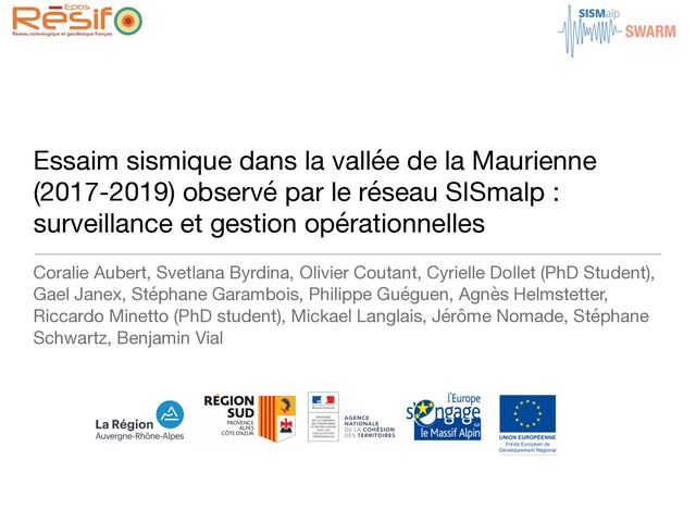 la Maurienne (2017-2019) observé par le réseau SISmalp : surveillance et gestion opérationnelles @SISMALP-Swarm website Coralie Aubert, Svetlana Byrdina, Olivier Coutant, Cyrielle Dollet (PhD Student), Gael Janex, Stéphane Garambois, Philippe Guéguen, Agnès Helmstetter, Riccardo Minetto (PhD student), Mickael Langlais, Jérôme Nomade, Stéphane Schwartz, Benjamin Vial Guéguen, P., Janex G., Nomade J., Langlais M., Helmstetter, A., Coutant O., Schwartz S., Dollet C., 2021. Unprecedented seismic swarm in the Maurienne valley (2017–2019) observed by the SISmalp Alpine seismic network : operational monitoring and management , CR Geoscience, doi 10.5802/crgeos.70 Dollet C, Guéguen P. 2021. Global occurrence models for human and economic losses due to earthquakes (1967–2018) considering exposed GDP and population. Natural Hazards. doi : 10.1007/s11069-021-04950-z