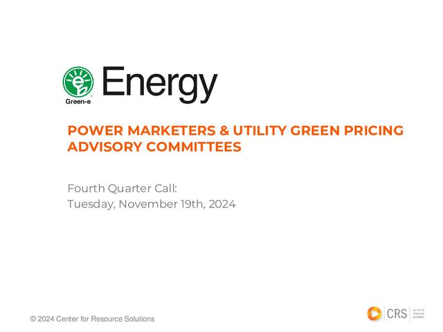 Resource Solutions o Open opportunity for participants to nominate themselves or their colleagues to represent their interests as Chair of one of the Advisory Committees o Responsibilities ▪ Quarterly Green-e Governance Board meetings ▪ Quarterly Green-e Participants Calls ▪ Engaging with participants o Nominations ▪ Send nominations to [email protected] by December 6, 2024