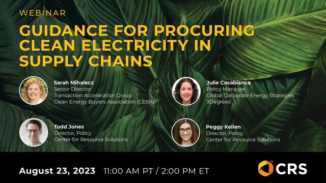 Join Center for Resource Solutions (CRS) for a discussion about designing clean electricity procurement programs for upstream value chains. The webinar will present CRS’s new Clean Energy Accounting Project (CEAP) guidance for supplier clean electricity procurement and profile existing corporate approaches to increasing clean electricity use in the supply chain. Speakers will also discuss the current state of greenhouse gas (GHG) emissions accounting for upstream clean electricity use and needs for the future.