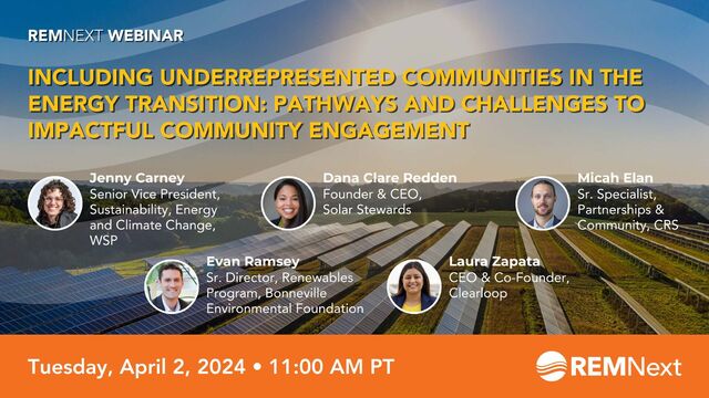 Join our panel of experts, April 2nd at 11:00am Pacific Time, for an insightful conversation on including underrepresented communities in the clean energy transition. During this hour-long webinar, we will discuss the panelists’ personal experience and contributions to the field, as well as key examples of renewable energy projects with meaningful community impact. Panelists will highlight essential necessary steps in engaging communities through impactful renewable energy projects, and the challenges associated with securing funding and reporting on successful projects. Discover tangible ways your stakeholder group can contribute to fostering a more just and equitable energy sector.