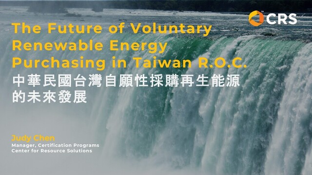 This webinar focused on the evolution of the Taiwan R.O.C. renewable energy market and the release of the new Green-e™ Renewable Energy Standard For Taiwan R.O.C. This new Standard and corresponding certification program is designed for companies to certify and publicize their purchases of qualifying energy or environmental attribute certificates. U.S. based Center for Resource Solutions presented details on the use of the Standard, ways that Taiwan R.O.C. companies and energy sellers (buyers of energy and sellers of energy) can participate in the Green-e™ program, and answer questions in this open forum setting about this new independent 3rd-party opportunity. CRS works cooperatively with Taiwan R.O.C. based TAGET (Taiwan Association for Green Energy Transition), which is co-presenting this webinar with CRS and will present their views on the rapid development of the Taiwan R.O.C. renewable energy market.