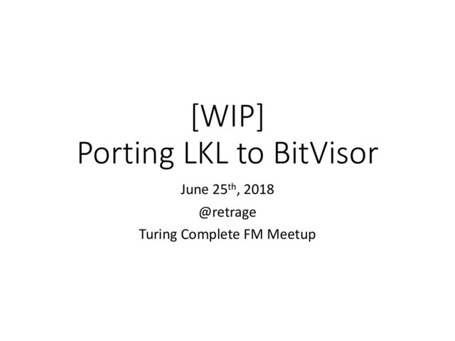 Omote, S. Hasegawa, T. Horie, M. Hirano, K. Kourai, Y. Oyama, E. Kawai, K. Kono, S. Chiba, Y. Shinjo, and K. Kato, “BitVisor: a thin hypervisor for enforcing i/o device security,” VEE 09 Proc. 2009 ACM SIGPLANSIGOPS Int. Conf. Virtual Exec. Environ., no. Vee, pp. 121–130, 2009. • [2] O. Purdila, L. A. Grijincu, and N. R. I. C. R. 2010 9th Tapus, “LKL: The Linux kernel library,” Roedunet Int. Conf. (RoEduNet), 2010 9th, no. May 2014, pp. 328–333, 2010. • [3] https://www.igel.co.jp/solution/ • [4] https://ja.osdn.net/projects/tinyvisor/ • [5] https://github.com/RKX1209/bitvisor-gdb • [6] https://www.slideshare.net/icchyr/how-to-port-to-bitvisor • [7] https://github.com/chikuwait/bitvisor_mruby • [8] https://github.com/littlekernel/lk 7