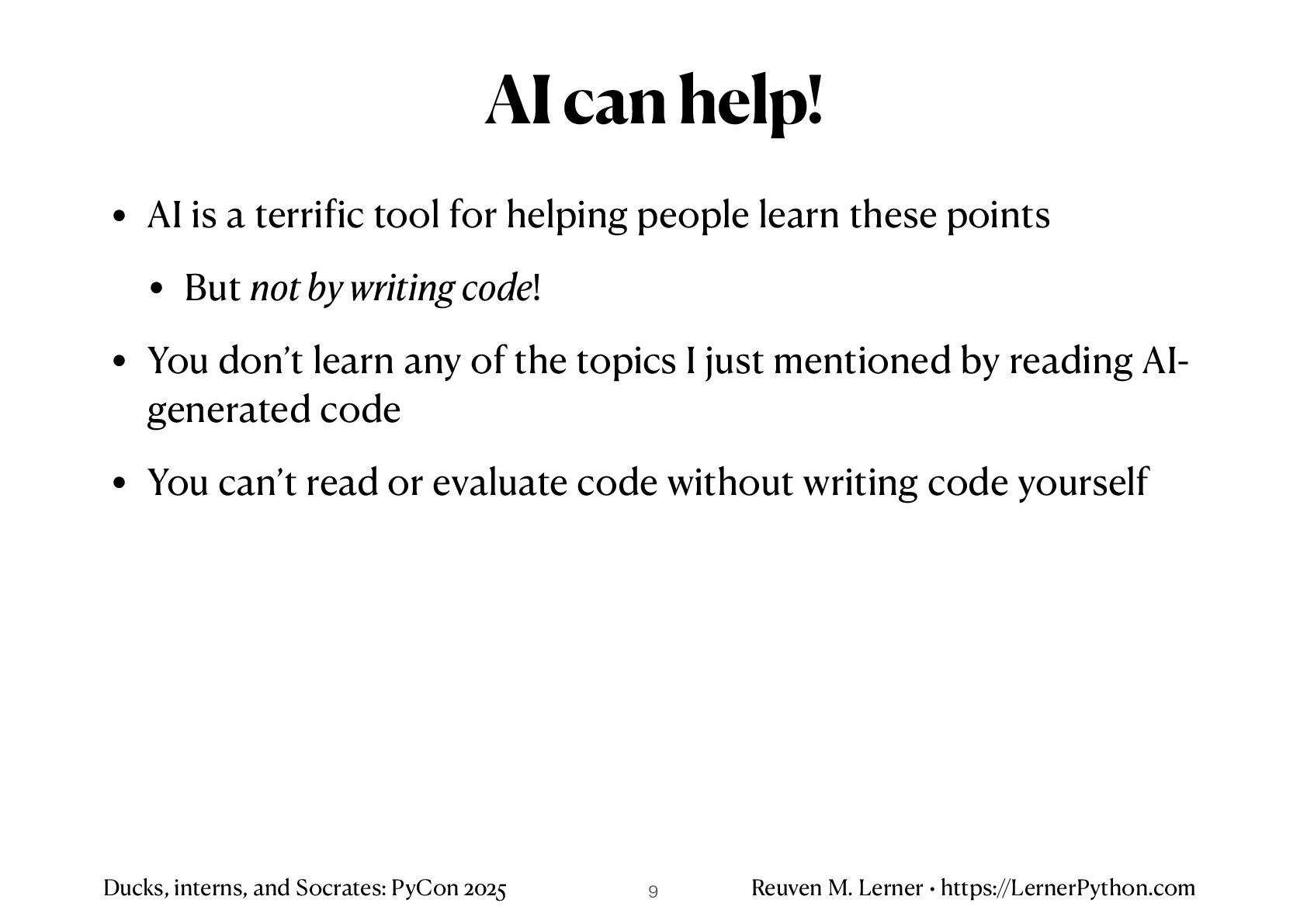 https://LernerPython.com • The Socratic method: Ask your students directed questions, forcing them to think and develop their thinking • The Reverse Socratic method: Ask the LLM directed questions to research or learn a subject • Asking the questions crystallizes your thinking • Many questions (and answers) reduce the chance of LLM errors • Argue, summarize, and develop with prompts like: • Counter-examples (“but what about…”) • Summaries (“So what you’re saying is…”) • Comparisons (“So X differs from Y by …”) • It’s totally OK (crucial, even!) to say, “I don’t understand.” Reverse Socratic method 21
