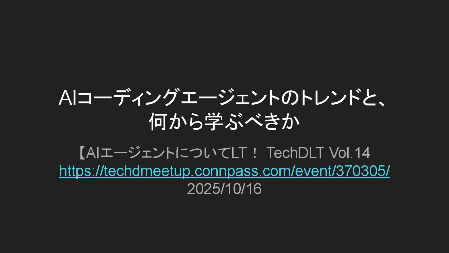 AIコーディングエージェントのトレンドと、 何から学ぶべきか 【AIエージェントについてLT! TechDLT Vol.14 https://techdmeetup.connpass.com/event/370305/ 2025/10/16