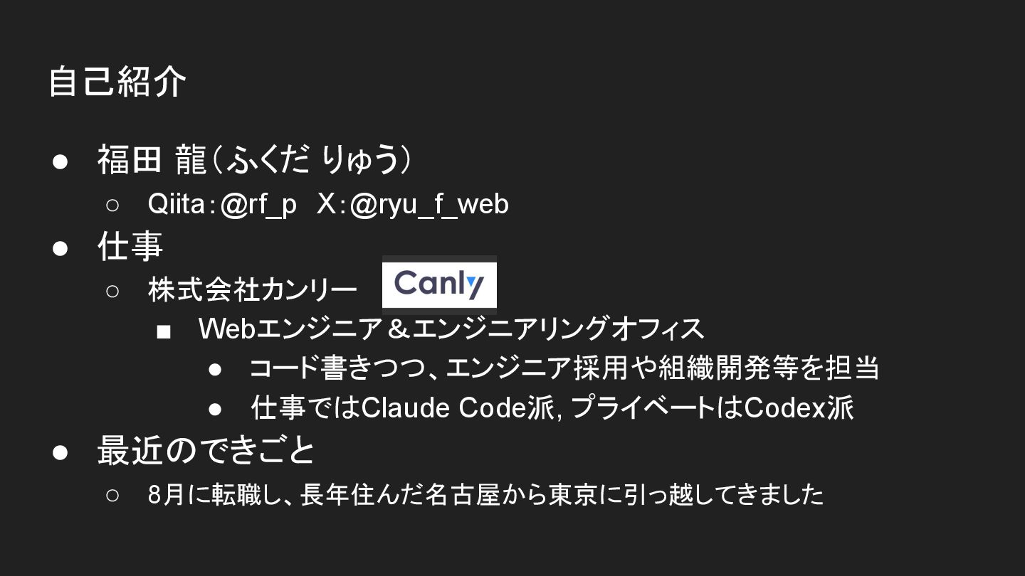 株式会社カンリー ▪ Webエンジニア&エンジニアリングオフィス • コード書きつつ、エンジニア採用や組織開発等を担当 • 仕事ではClaude Code派, プライベートはCodex派 • 最近のできごと ◦ 8月に転職し、長年住んだ名古屋から東京に引っ越してきました