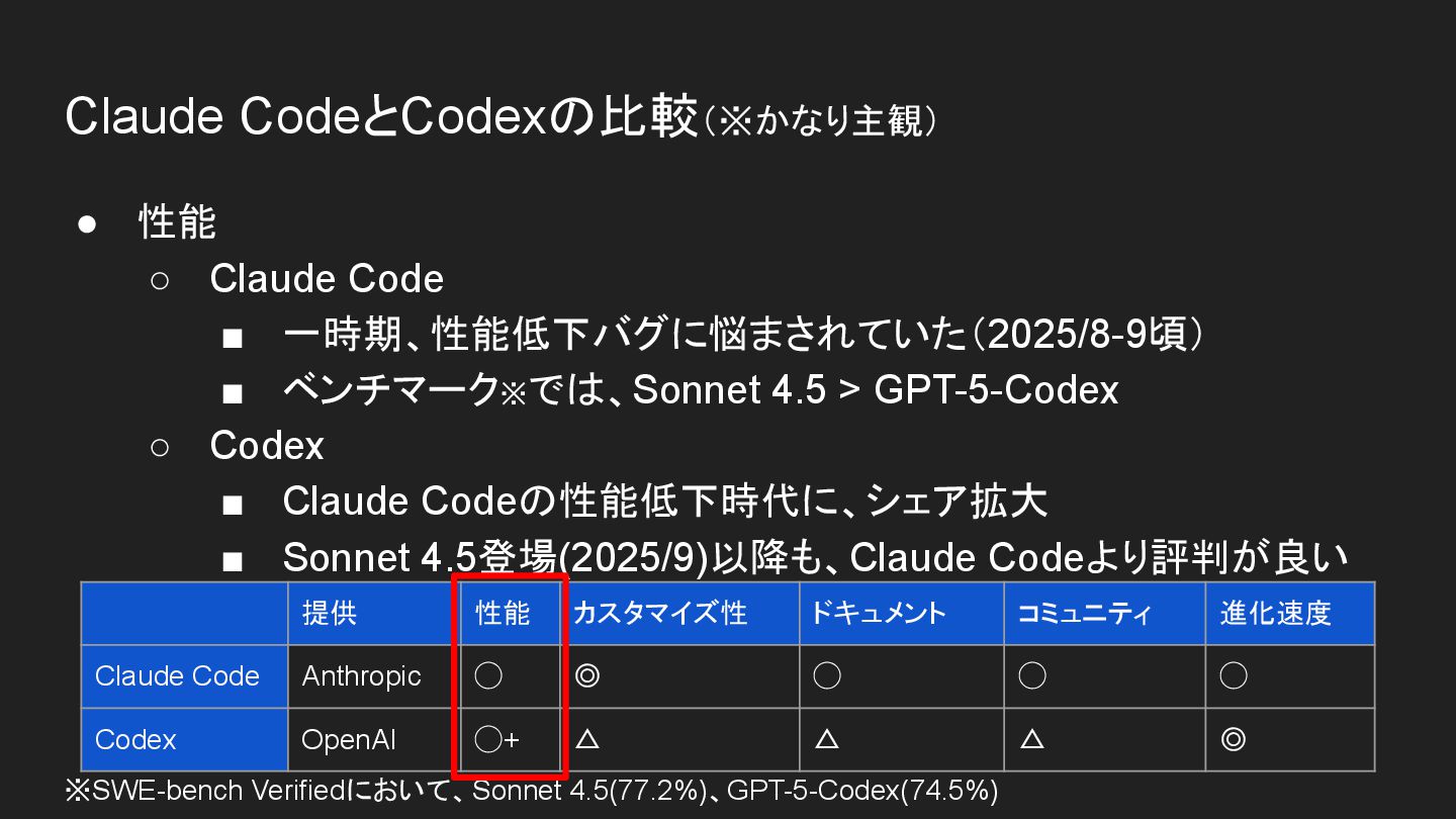 Claude CodeとCodexの比較(※かなり主観) • 性能 ◦ Claude Code ▪ 一時期、性能低下バグに悩まされていた ▪