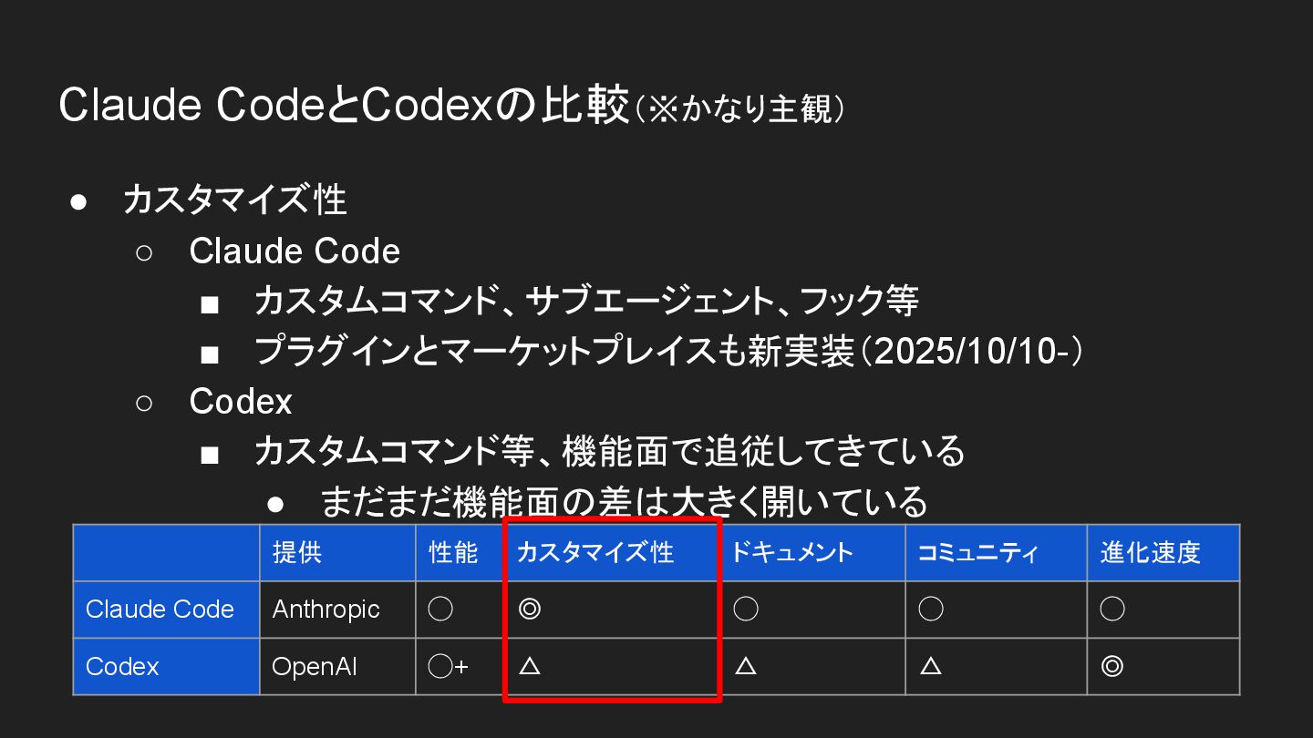プラグインとマーケットプレイスも新実装(2025/10/10-) ◦ Codex ▪ カスタムコマンド等、機能面で追従してきている • まだまだ機能面の差は大きく開いている 提供 性能 カスタマイズ性 ドキュメント コミュニティ 進化速度 Claude Code Anthropic ◯ ◎ ◯ ◯ ◯ Codex OpenAI ◯+ △ △ △ ◎