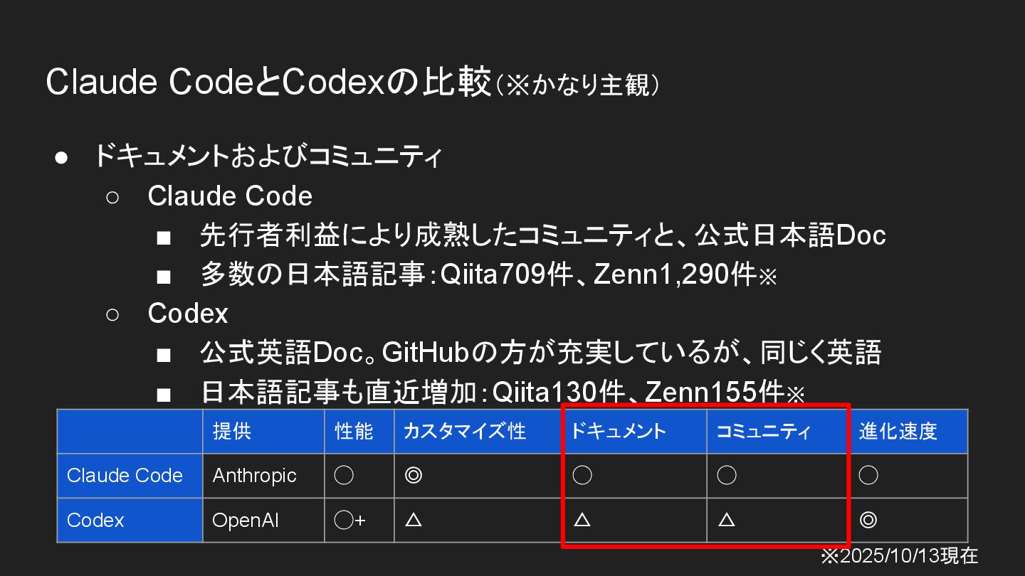 Claude CodeとCodexの比較(※かなり主観) • ドキュメントおよびコミュニティ ◦ Claude Code ▪ 先行者利益により成熟したコミュニティと、公式日本語Doc ▪