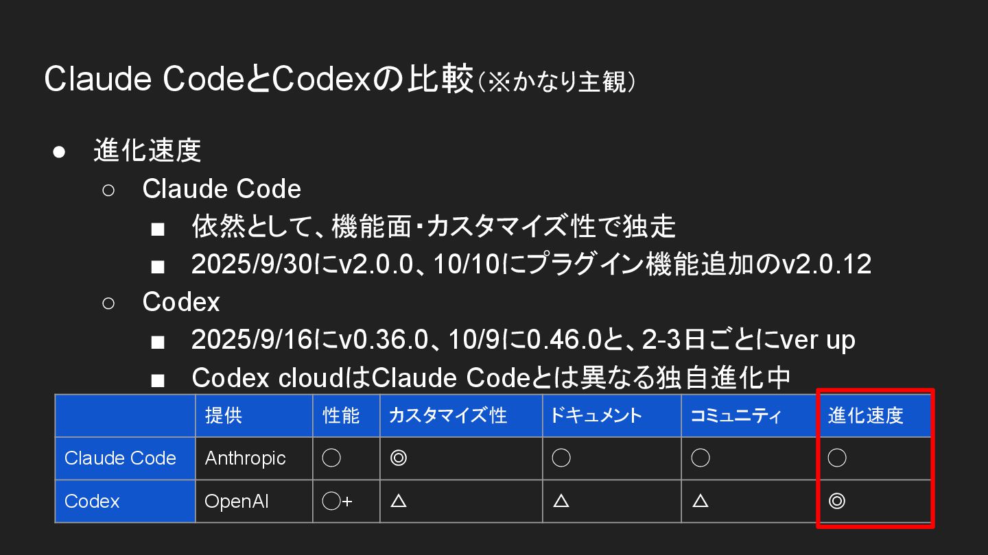 2025/9/30にv2.0.0、10/10にプラグイン機能追加のv2.0.12 ◦ Codex ▪ 2025/9/16にv0.36.0、10/9に0.46.0と、2-3日ごとにver up ▪ Codex cloudはClaude Codeとは異なる独自進化中 提供 性能 カスタマイズ性 ドキュメント コミュニティ 進化速度 Claude Code Anthropic ◯ ◎ ◯ ◯ ◯ Codex OpenAI ◯+ △ △ △ ◎