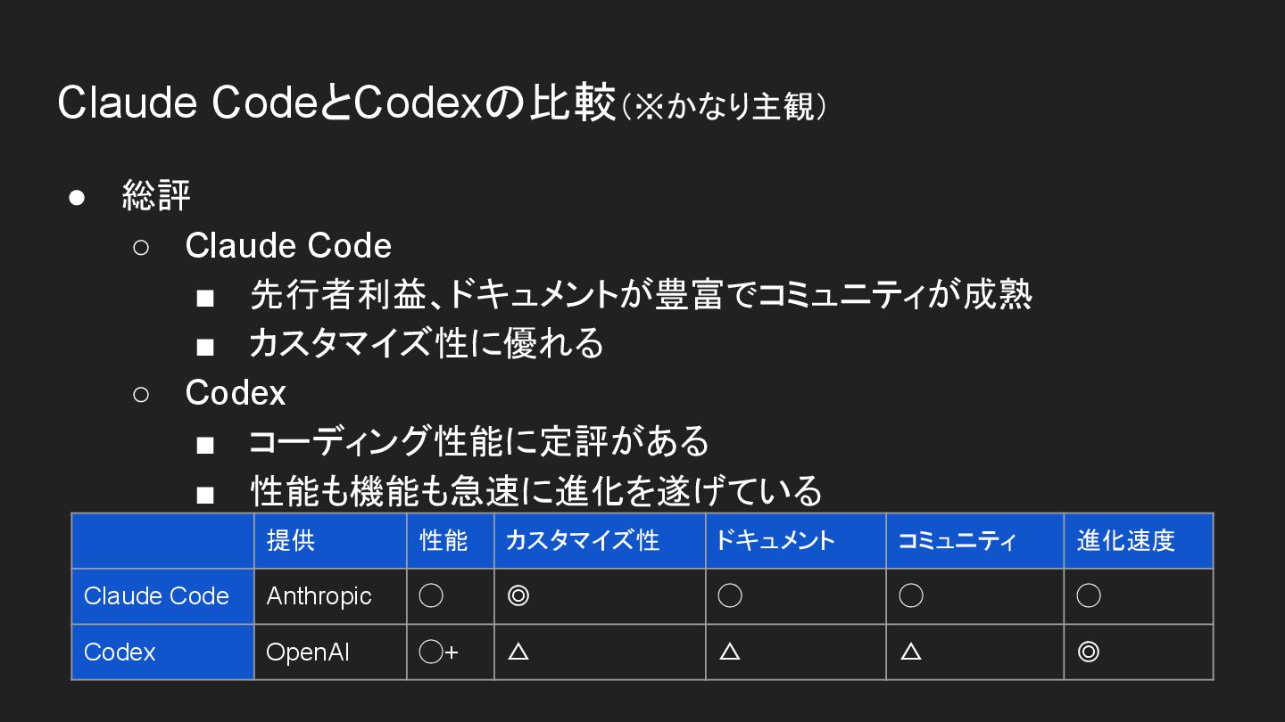 Claude CodeとCodexの比較(※かなり主観) • 総評 ◦ Claude Code ▪ 先行者利益、ドキュメントが豊富でコミュニティが成熟 ▪