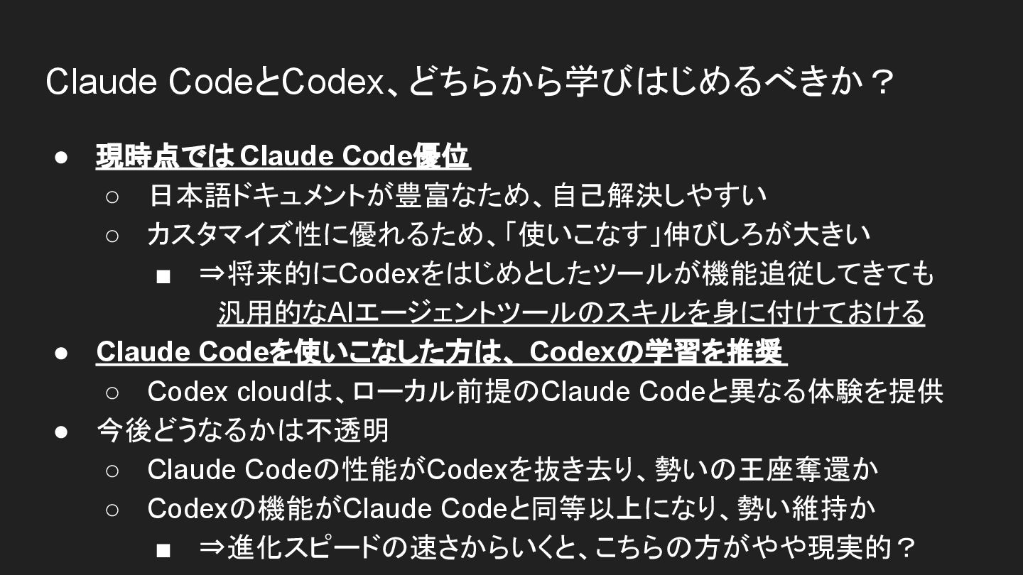 ▪ ⇒将来的にCodexをはじめとしたツールが機能追従してきても 汎用的なAIエージェントツールのスキルを身に付けておける • Claude Codeを使いこなした方は、 Codexの学習を推奨 ◦ Codex cloudは、ローカル前提のClaude Codeと異なる体験を提供 • 今後どうなるかは不透明 ◦ Claude Codeの性能がCodexを抜き去り、勢いの王座奪還か ◦ Codexの機能がClaude Codeと同等以上になり、勢い維持か ▪ ⇒進化スピードの速さからいくと、こちらの方がやや現実的?