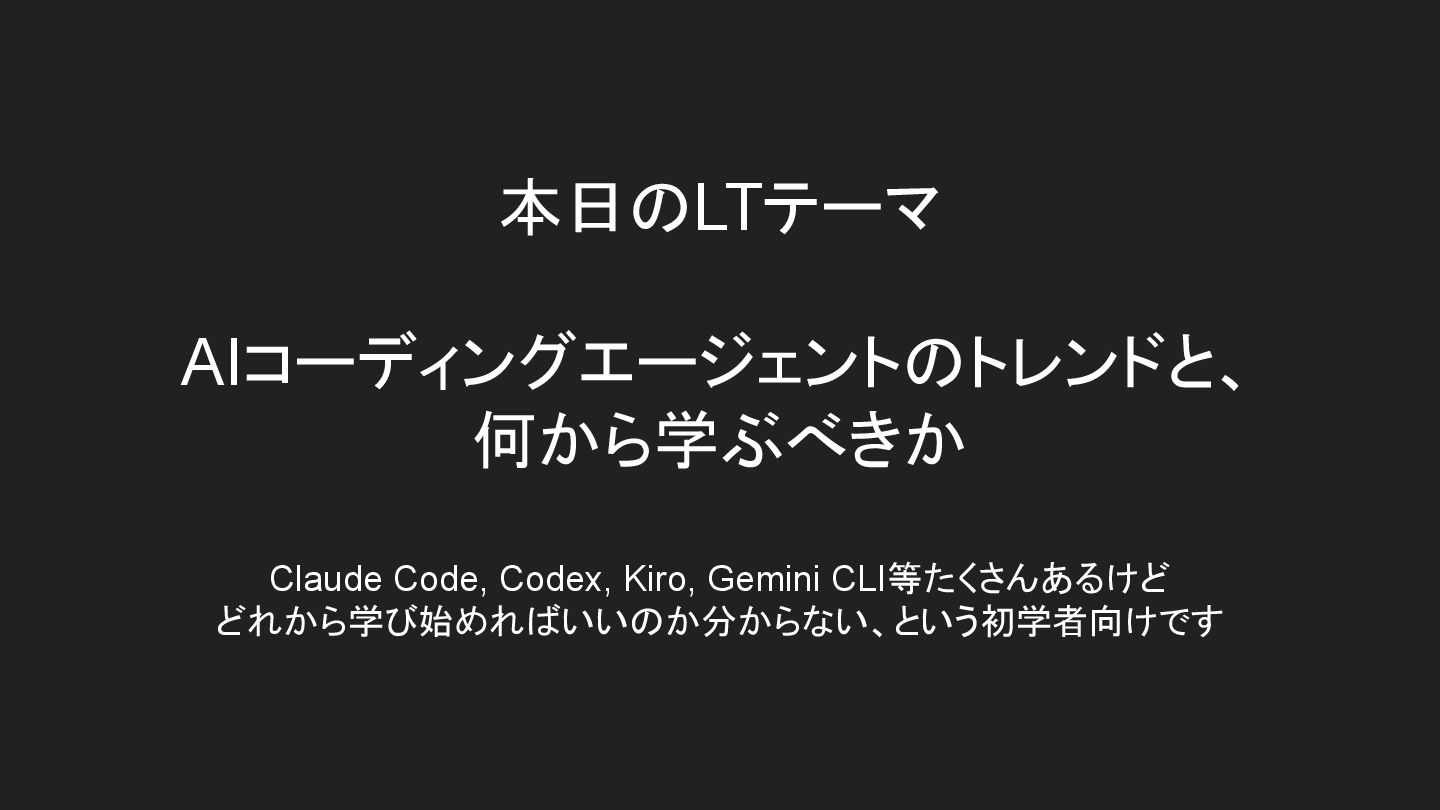 本日のLTテーマ AIコーディングエージェントのトレンドと、 何から学ぶべきか Claude Code, Codex, Kiro, Gemini CLI等たくさんあるけど どれから学び始めればいいのか分からない、という初学者向けです