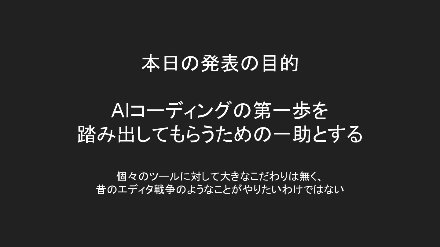 本日の発表の目的 AIコーディングの第一歩を 踏み出してもらうための一助とする 個々のツールに対して大きなこだわりは無く、 昔のエディタ戦争のようなことがやりたいわけではない