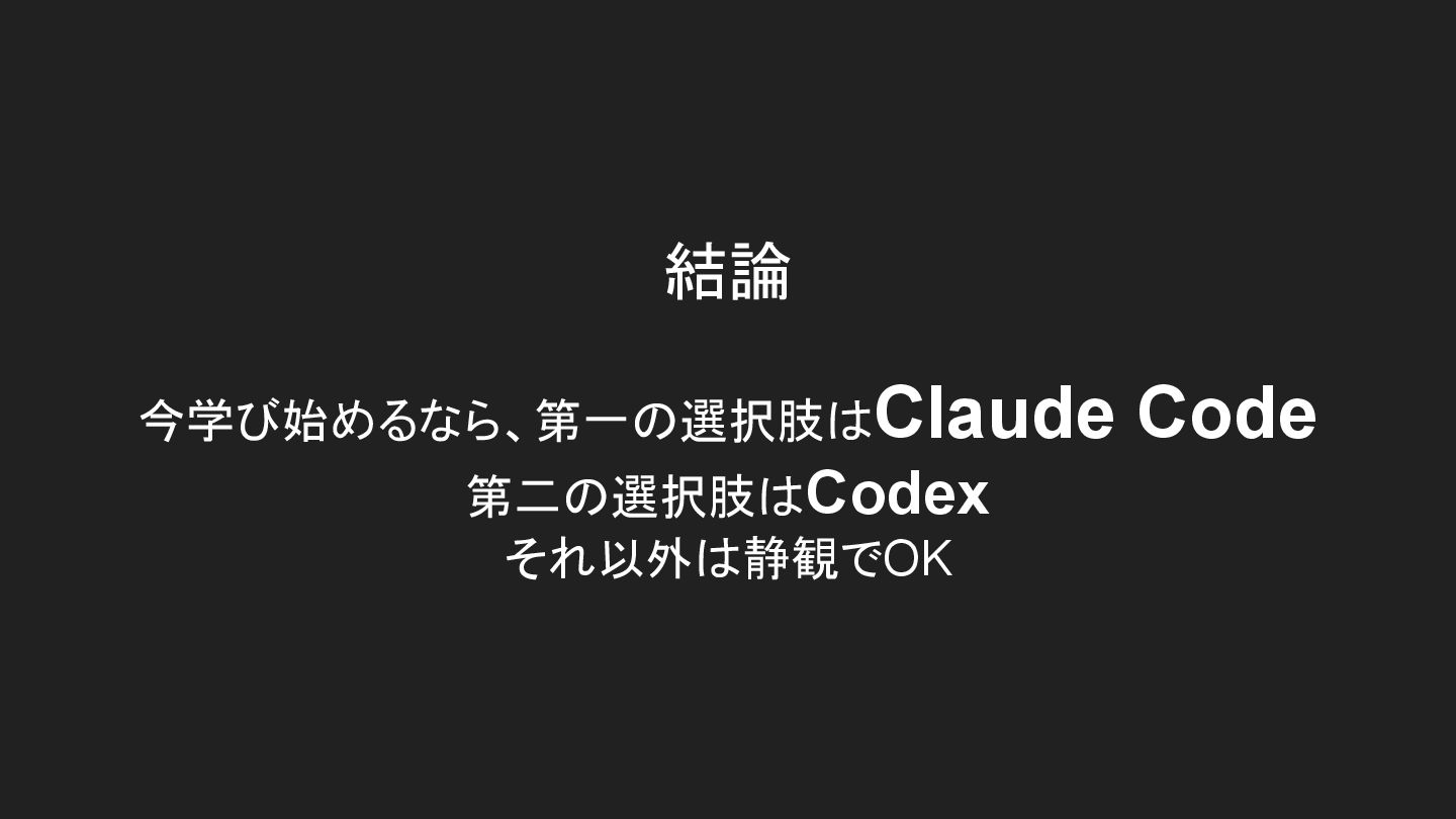 結論 今学び始めるなら、第一の選択肢はClaude Code 第二の選択肢はCodex それ以外は静観でOK