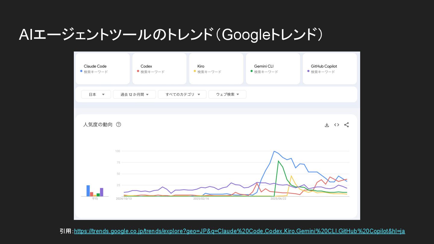 AIエージェントツールのトレンド(Googleトレンド) 引用:https://trends.google.co.jp/trends/explore?geo=JP&q=Claude%20Code,Codex,Kiro,Gemini%20CLI,GitHub%20Copilot&hl=ja