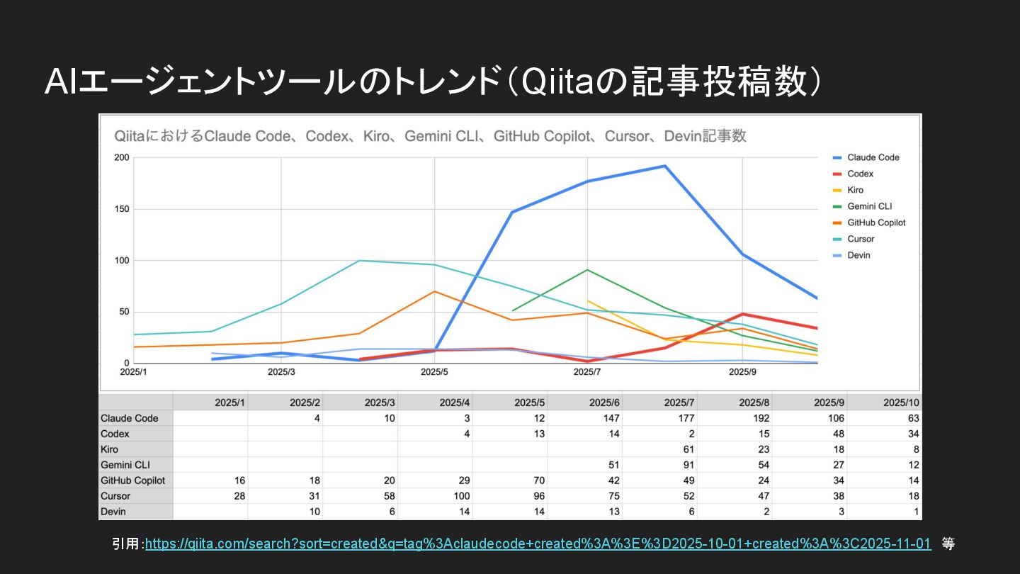 AIエージェントツールのトレンド(Qiitaの記事投稿数) 引用:https://qiita.com/search?sort=created&q=tag%3Aclaudecode+created%3A%3E%3D2025-10-01+created%3A%3C2025-11-01 等