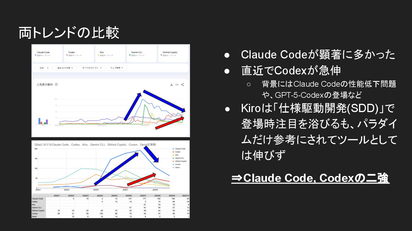 • Kiroは「仕様駆動開発(SDD)」で 登場時注目を浴びるも、パラダイ ムだけ参考にされてツールとして は伸びず ⇒Claude Code, Codexの二強