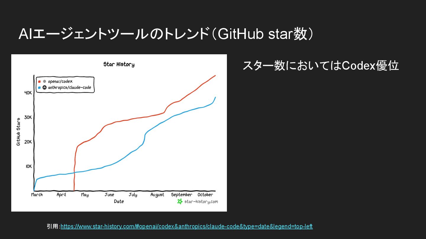 AIエージェントツールのトレンド(GitHub star数) 引用:https://www.star-history.com/#openai/codex&anthropics/claude-code&type=date&legend=top-left スター数においてはCodex優位