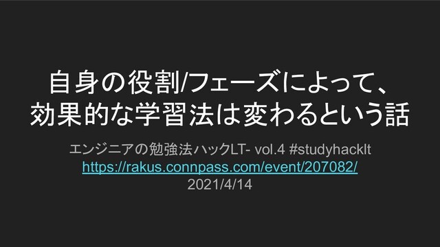 自身の役割/フェーズによって、 効果的な学習法は変わるという話 エンジニアの勉強法ハックLT- vol.4 #studyhacklt https://rakus.connpass.com/event/207082/ 2021/4/14