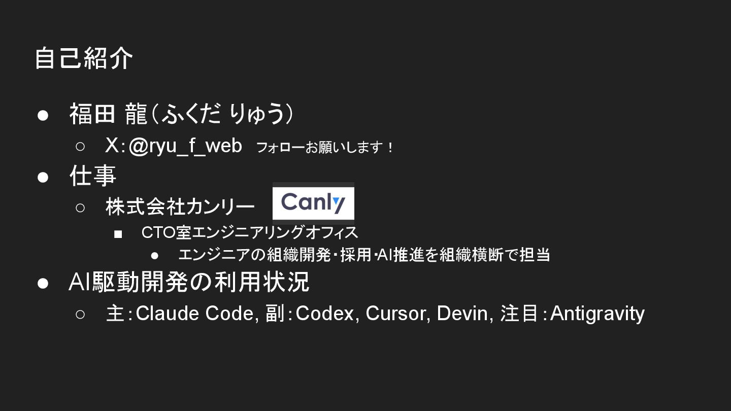 株式会社カンリー ▪ CTO室エンジニアリングオフィス • エンジニアの組織開発・採用・AI推進を組織横断で担当 • AI駆動開発の利用状況 ◦ 主:Claude Code, 副:Codex, Cursor, Devin, 注目:Antigravity
