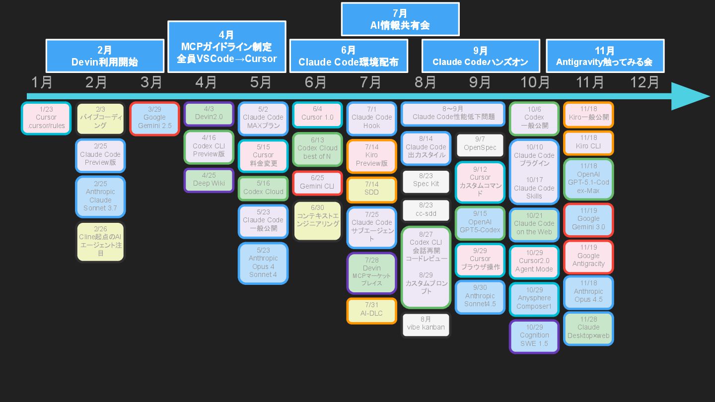 Codex 一般公開 10/29 Cursor2.0 Agent Mode 10/29 Cognition SWE 1.5 10/29 Anysphere Composer1 10/21 Claude Code on the Web 1/23 Cursor .cursor/rules 5/16 Codex Cloud 5/2 Claude Code MAXプラン 5/23 Claude Code 一般公開 5/23 Anthropic Opus 4 Sonnet 4 5/15 Cursor 料金変更 7/14 Kiro Preview版 7/31 AI-DLC 7/1 Claude Code Hook 7/25 Claude Code サブエージェン ト 7/14 SDD 7/28 Devin MCPマーケット プレイス 4/3 Devin2.0 4/16 Codex CLI Preview版 4/25 Deep Wiki 3/29 Google Gemini 2.5 2月 3月 4月 5月 6月 7月 8月 9月 10月 11月 12月 11/18 Kiro一般公開 11/19 Google Antigracity 11/18 OpenAI GPT-5.1-Cod ex-Max 11/18 Kiro CLI 11/19 Google Gemini 3.0 11/18 Anthropic Opus 4.5 11/28 Claude Desktop×web 9/15 OpenAI GPT5-Codex 9/30 Anthropic Sonnet4.5 8/14 Claude Code 出力スタイル 8/23 Spec Kit 8/27 Codex CLI 会話再開 コードレビュー 8/29 カスタムプロン プト 8〜9月 Claude Code性能低下問題 8/23 cc-sdd 8月 vibe kanban 9/29 Cursor ブラウザ操作 9/12 Cursor カスタムコマン ド 9/7 OpenSpec 2月 Devin利用開始 4月 MCPガイドライン制定 全員VSCode→Cursor 6月 Claude Code環境配布 7月 AI情報共有会 9月 Claude Codeハンズオン 11月 Antigravity触ってみる会 2/3 バイブコーディ ング 2/26 Cline起点のAI エージェント注 目 2/25 Claude Code Preview版 2/25 Anthropic Claude Sonnet 3.7 6/30 コンテキストエ ンジニアリング 6/13 Codex Cloud best of N 6/25 Gemini CLI 6/4 Cursor 1.0