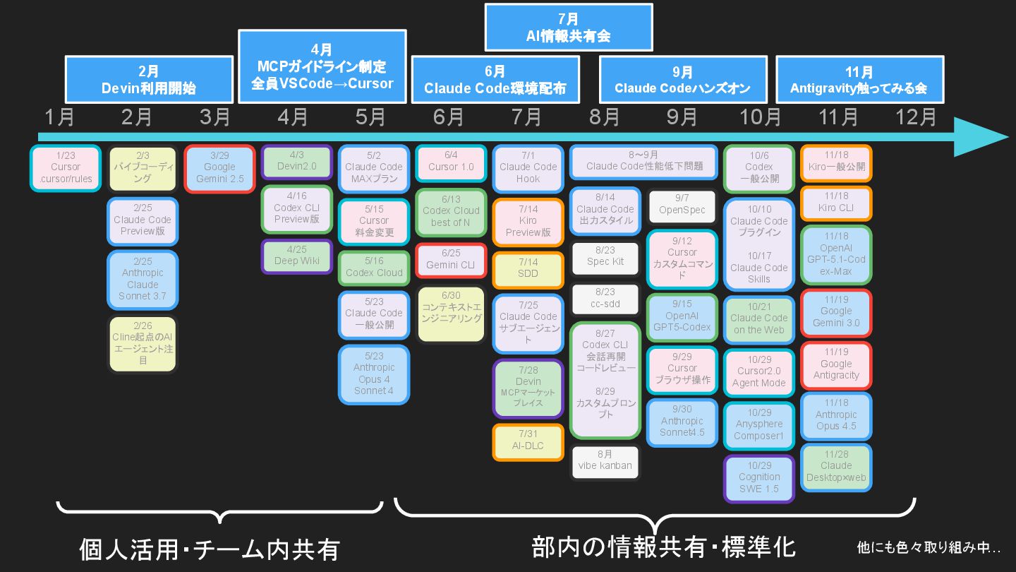 Codex 一般公開 10/29 Cursor2.0 Agent Mode 10/29 Cognition SWE 1.5 10/29 Anysphere Composer1 10/21 Claude Code on the Web 1/23 Cursor .cursor/rules 5/16 Codex Cloud 5/2 Claude Code MAXプラン 5/23 Claude Code 一般公開 5/23 Anthropic Opus 4 Sonnet 4 5/15 Cursor 料金変更 7/14 Kiro Preview版 7/31 AI-DLC 7/1 Claude Code Hook 7/25 Claude Code サブエージェン ト 7/14 SDD 7/28 Devin MCPマーケット プレイス 4/3 Devin2.0 4/16 Codex CLI Preview版 4/25 Deep Wiki 3/29 Google Gemini 2.5 2月 3月 4月 5月 6月 7月 8月 9月 10月 11月 12月 11/18 Kiro一般公開 11/19 Google Antigracity 11/18 OpenAI GPT-5.1-Cod ex-Max 11/18 Kiro CLI 11/19 Google Gemini 3.0 11/18 Anthropic Opus 4.5 11/28 Claude Desktop×web 9/15 OpenAI GPT5-Codex 9/30 Anthropic Sonnet4.5 8/14 Claude Code 出力スタイル 8/23 Spec Kit 8/27 Codex CLI 会話再開 コードレビュー 8/29 カスタムプロン プト 8〜9月 Claude Code性能低下問題 8/23 cc-sdd 8月 vibe kanban 9/29 Cursor ブラウザ操作 9/12 Cursor カスタムコマン ド 9/7 OpenSpec 2月 Devin利用開始 4月 MCPガイドライン制定 全員VSCode→Cursor 6月 Claude Code環境配布 7月 AI情報共有会 9月 Claude Codeハンズオン 11月 Antigravity触ってみる会 個人活用・チーム内共有 2/3 バイブコーディ ング 2/26 Cline起点のAI エージェント注 目 2/25 Claude Code Preview版 2/25 Anthropic Claude Sonnet 3.7 6/30 コンテキストエ ンジニアリング 6/13 Codex Cloud best of N 6/25 Gemini CLI 6/4 Cursor 1.0