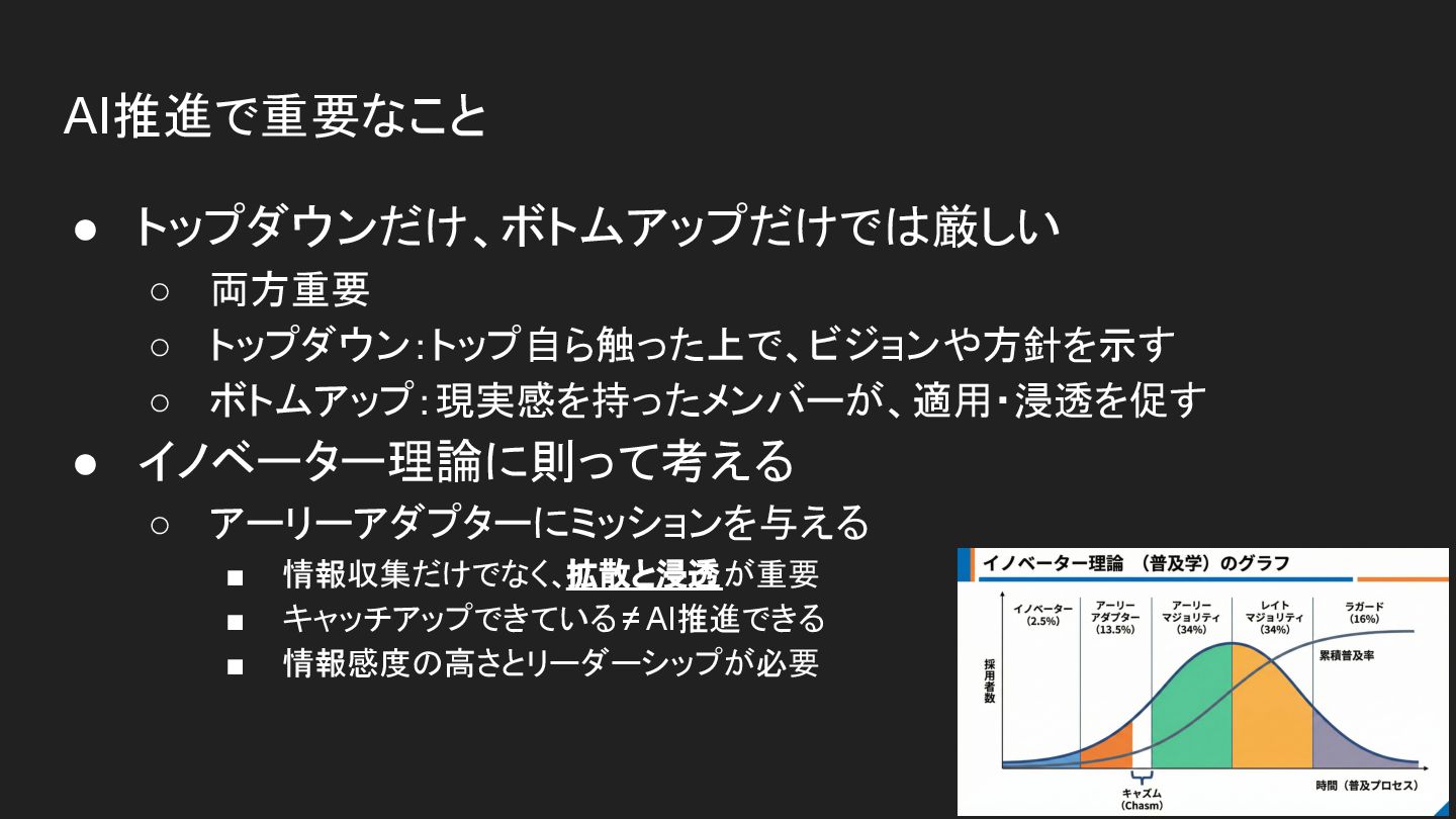 イノベーター理論に則って考える ◦ アーリーアダプターにミッションを与える ▪ 情報収集だけでなく、拡散と浸透が重要 ▪ キャッチアップできている ≠ AI推進できる ▪ 情報感度の高さとリーダーシップが必要