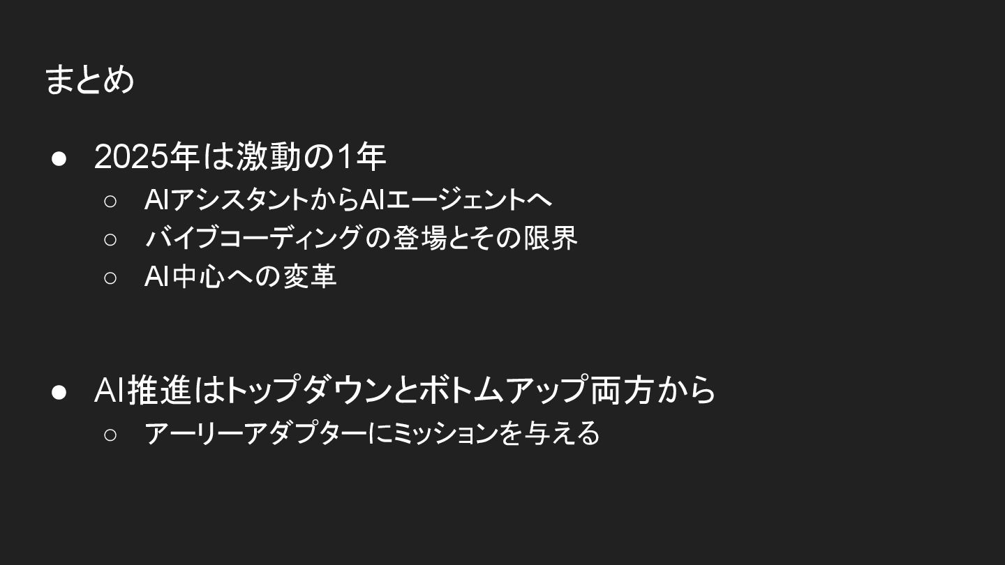 12. まとめ • 2025年は激動の1年 ◦ AIアシスタントからAIエージェントへ ◦ バイブコーディングの登場とその限界 ◦ AI中心への変革 •