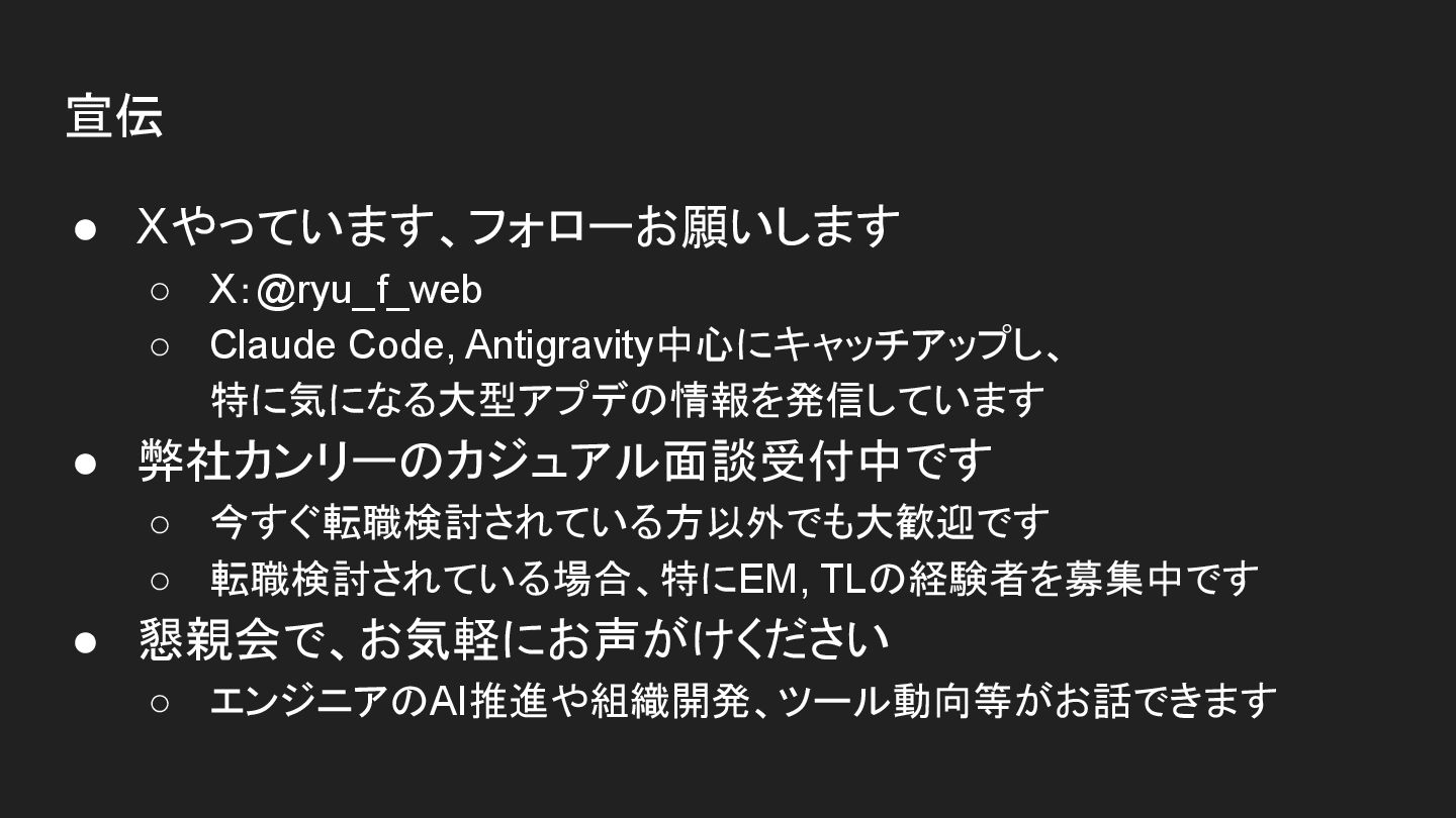 • 弊社カンリーのカジュアル面談受付中です ◦ 今すぐ転職検討されている方以外でも大歓迎です ◦ 転職検討されている場合、特にEM, TLの経験者を募集中です • 懇親会で、お気軽にお声がけください ◦ エンジニアのAI推進や組織開発、ツール動向等がお話できます