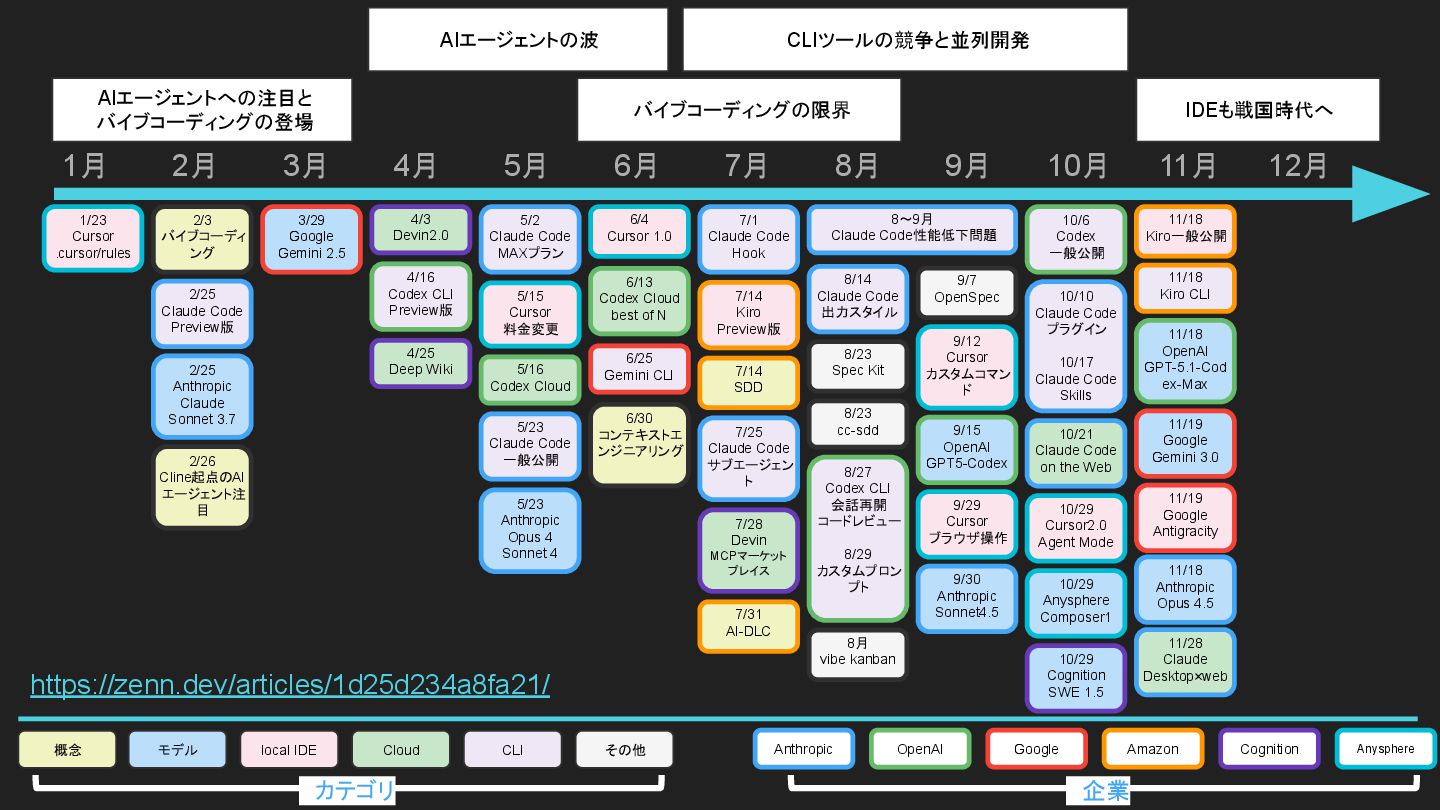 Amazon Cognition Anysphere Anthropic AIエージェントへの注目と バイブコーディングの登場 AIエージェントの波 バイブコーディングの限界 CLIツールの競争と並列開発 IDEも戦国時代へ 10/10 Claude Code プラグイン 10/17 Claude Code Skills 10/6 Codex 一般公開 10/29 Cursor2.0 Agent Mode 10/29 Cognition SWE 1.5 10/29 Anysphere Composer1 10/21 Claude Code on the Web  カテゴリ   企業  1/23 Cursor .cursor/rules 5/16 Codex Cloud 5/2 Claude Code MAXプラン 5/23 Claude Code 一般公開 5/23 Anthropic Opus 4 Sonnet 4 5/15 Cursor 料金変更 7/14 Kiro Preview版 7/31 AI-DLC 7/1 Claude Code Hook 7/25 Claude Code サブエージェン ト 7/14 SDD 7/28 Devin MCPマーケット プレイス 4/3 Devin2.0 4/16 Codex CLI Preview版 4/25 Deep Wiki 3/29 Google Gemini 2.5 2月 3月 4月 5月 6月 7月 8月 9月 10月 11月 12月 https://zenn.dev/articles/1d25d234a8fa21/ 11/18 Kiro一般公開 11/19 Google Antigracity 11/18 OpenAI GPT-5.1-Cod ex-Max 11/18 Kiro CLI 11/19 Google Gemini 3.0 11/18 Anthropic Opus 4.5 11/28 Claude Desktop×web 9/15 OpenAI GPT5-Codex 9/30 Anthropic Sonnet4.5 8/14 Claude Code 出力スタイル 8/23 Spec Kit 8/27 Codex CLI 会話再開 コードレビュー 8/29 カスタムプロン プト 8〜9月 Claude Code性能低下問題 8/23 cc-sdd 8月 vibe kanban 9/29 Cursor ブラウザ操作 9/12 Cursor カスタムコマン ド 9/7 OpenSpec 2/3 バイブコーディ ング 2/26 Cline起点のAI エージェント注 目 2/25 Claude Code Preview版 2/25 Anthropic Claude Sonnet 3.7 6/30 コンテキストエ ンジニアリング 6/13 Codex Cloud best of N 6/25 Gemini CLI 6/4 Cursor 1.0