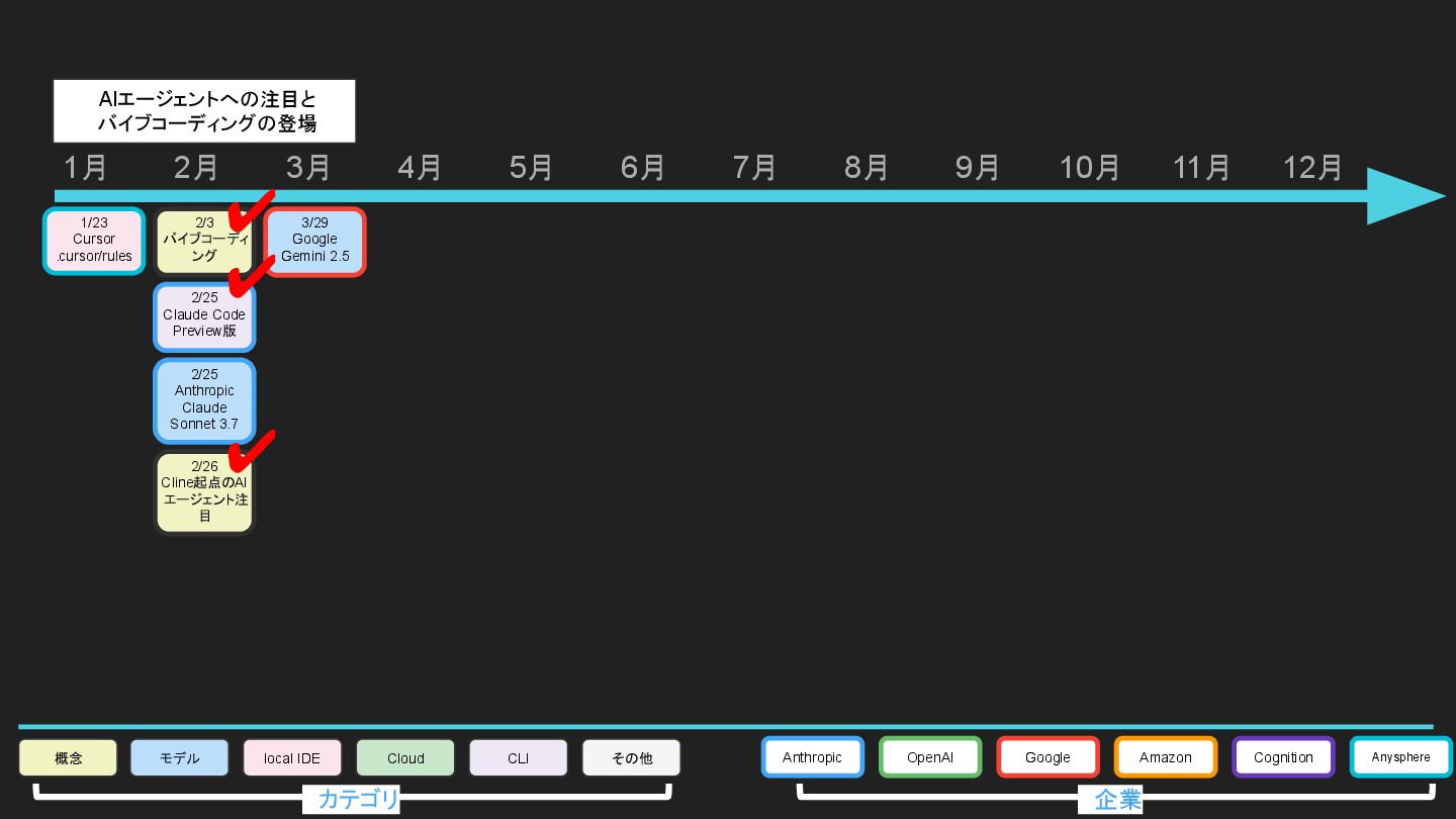 Preview版 2/25 Anthropic Claude Sonnet 3.7 1月 概念 local IDE CLI モデル Cloud その他 Google OpenAI Amazon Cognition Anysphere Anthropic AIエージェントへの注目と バイブコーディングの登場  カテゴリ   企業  1/23 Cursor .cursor/rules 3/29 Google Gemini 2.5 2月 3月 4月 5月 6月 7月 8月 9月 10月 11月 12月 ✔ ✔ ✔