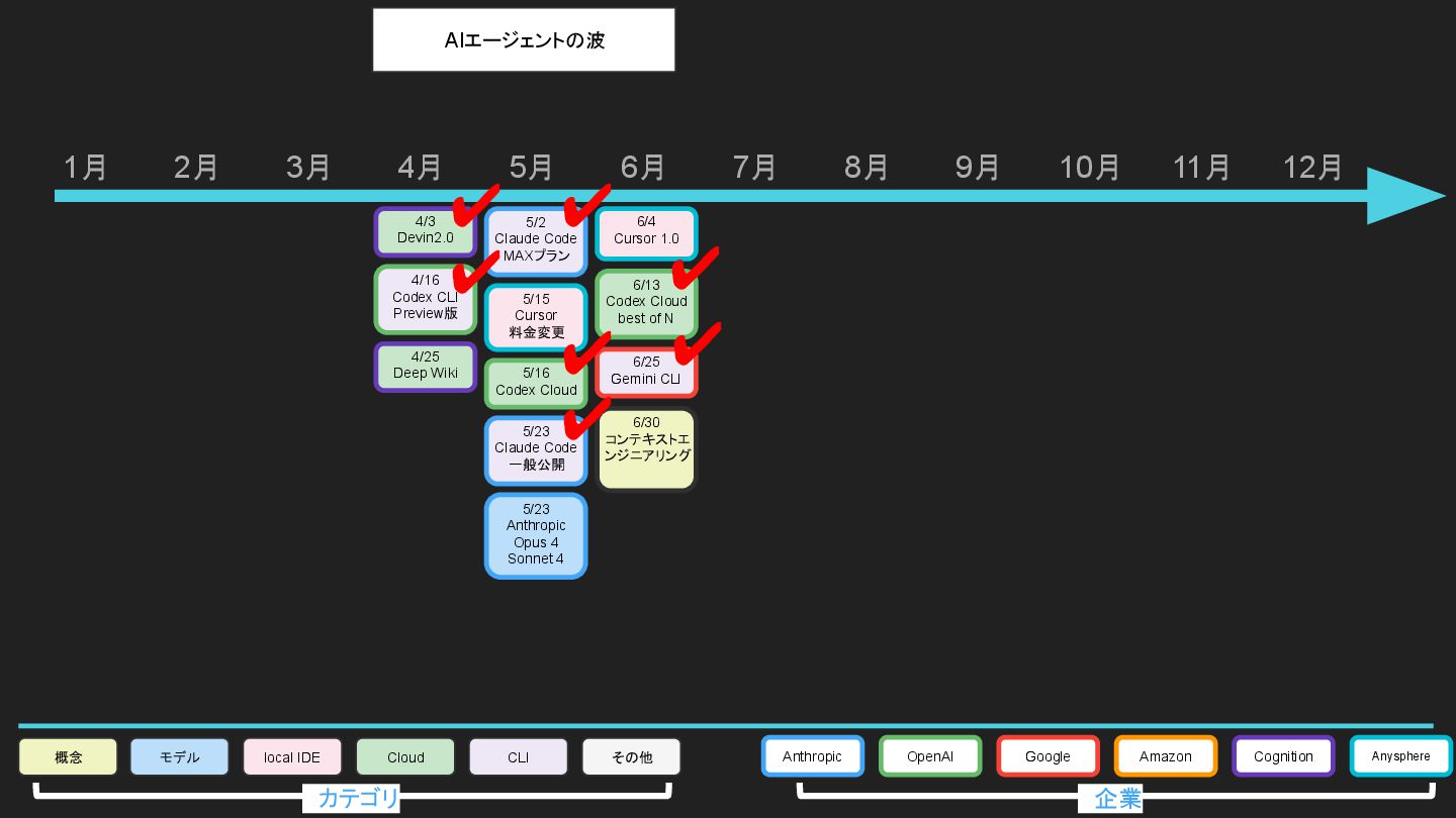 Gemini CLI 6/4 Cursor 1.0 1月 概念 local IDE CLI モデル Cloud その他 Google OpenAI Amazon Cognition Anysphere Anthropic AIエージェントの波  カテゴリ   企業  5/16 Codex Cloud 5/2 Claude Code MAXプラン 5/23 Claude Code 一般公開 5/23 Anthropic Opus 4 Sonnet 4 5/15 Cursor 料金変更 4/3 Devin2.0 4/16 Codex CLI Preview版 4/25 Deep Wiki 2月 3月 4月 5月 6月 7月 8月 9月 10月 11月 12月 ✔ ✔ ✔ ✔ ✔ ✔ ✔