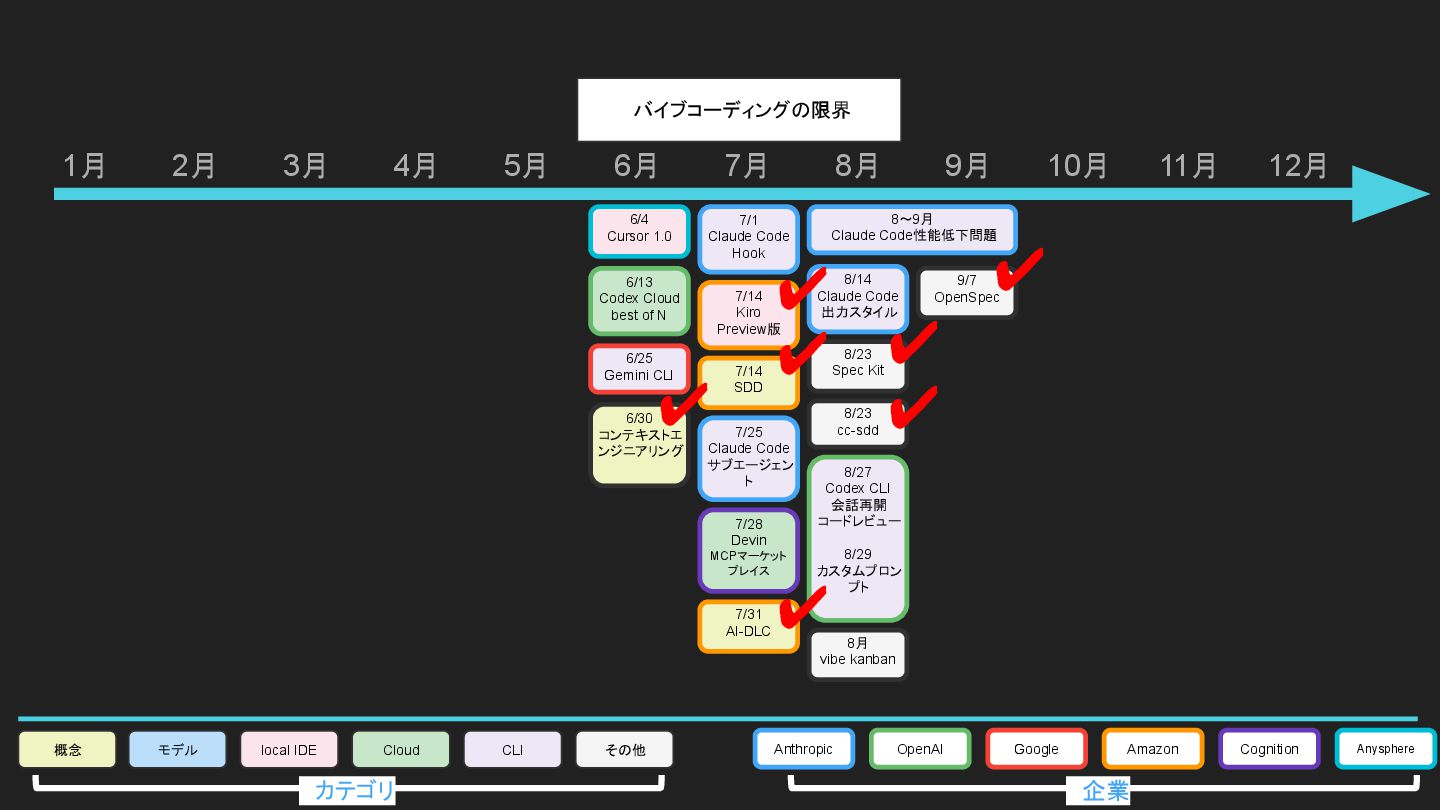 Amazon Cognition Anysphere Anthropic バイブコーディングの限界  カテゴリ   企業  7/14 Kiro Preview版 7/31 AI-DLC 7/1 Claude Code Hook 7/25 Claude Code サブエージェン ト 7/14 SDD 7/28 Devin MCPマーケット プレイス 2月 3月 4月 5月 6月 7月 8月 9月 10月 11月 12月 8/14 Claude Code 出力スタイル 8/23 Spec Kit 8/27 Codex CLI 会話再開 コードレビュー 8/29 カスタムプロン プト 8〜9月 Claude Code性能低下問題 8/23 cc-sdd 8月 vibe kanban 9/7 OpenSpec ✔ ✔ ✔ ✔ ✔ ✔ 6/30 コンテキストエ ンジニアリング 6/13 Codex Cloud best of N 6/25 Gemini CLI 6/4 Cursor 1.0 ✔