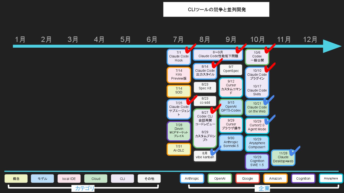 Amazon Cognition Anysphere Anthropic CLIツールの競争と並列開発 10/10 Claude Code プラグイン 10/17 Claude Code Skills 10/6 Codex 一般公開 10/29 Cursor2.0 Agent Mode 10/29 Cognition SWE 1.5 10/29 Anysphere Composer1 10/21 Claude Code on the Web  カテゴリ   企業  7/14 Kiro Preview版 7/31 AI-DLC 7/1 Claude Code Hook 7/25 Claude Code サブエージェン ト 7/14 SDD 7/28 Devin MCPマーケット プレイス 2月 3月 4月 5月 6月 7月 8月 9月 10月 11月 12月 11/28 Claude Desktop×web 9/15 OpenAI GPT5-Codex 9/30 Anthropic Sonnet4.5 8/14 Claude Code 出力スタイル 8/23 Spec Kit 8/27 Codex CLI 会話再開 コードレビュー 8/29 カスタムプロン プト 8〜9月 Claude Code性能低下問題 8/23 cc-sdd 8月 vibe kanban 9/29 Cursor ブラウザ操作 9/12 Cursor カスタムコマン ド 9/7 OpenSpec ✔ ✔ ✔ ✔ ✔ ✔ ✔ ✔ ✔ ✔ ✔