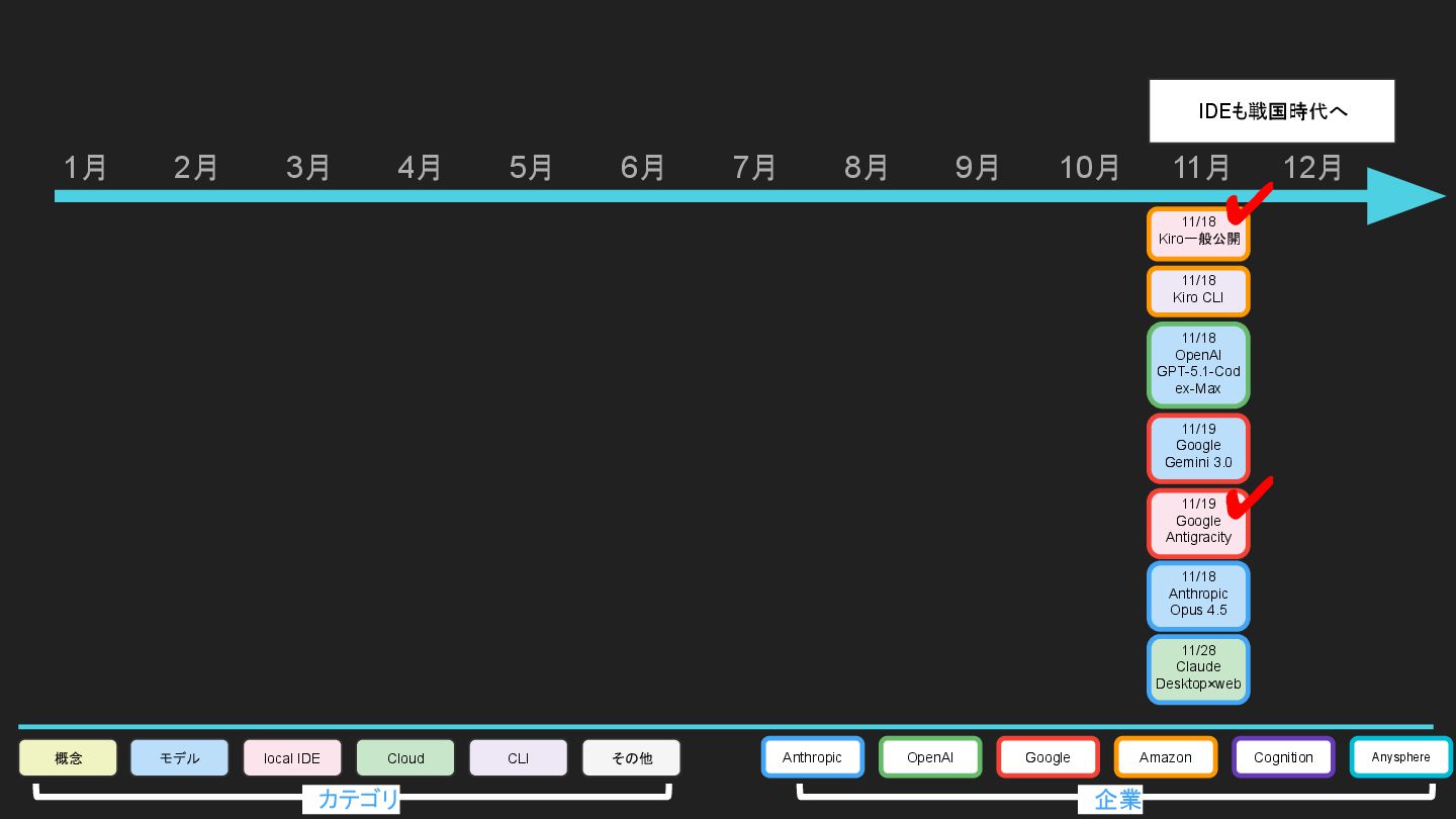 Amazon Cognition Anysphere Anthropic IDEも戦国時代へ  カテゴリ   企業  2月 3月 4月 5月 6月 7月 8月 9月 10月 11月 12月 11/18 Kiro一般公開 11/19 Google Antigracity 11/18 OpenAI GPT-5.1-Cod ex-Max 11/18 Kiro CLI 11/19 Google Gemini 3.0 11/18 Anthropic Opus 4.5 11/28 Claude Desktop×web ✔ ✔