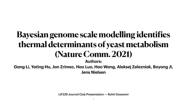 Gosw a mi Bayesian genome scale modelling identi f ies thermal determinants of yeast metabolism (Nature Comm. 2021) Authors: G a ng Li, Y a ting Hu, J a n Zrimec, H a o Luo, H a o W a ng, Aleksej Zelezni a k, Boy a ng Ji, Jens Nielsen 1