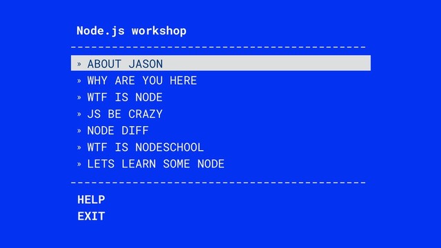 » WTF IS NODE » JS BE CRAZY » NODE DIFF » WTF IS NODESCHOOL » LETS LEARN SOME NODE ------------------------------------------- ------------------------------------------- HELP EXIT