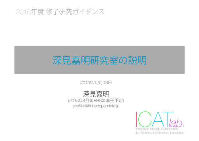 ICAT lab. ਂݟՅ໌ʹ͍ͭͯ • ৬ܦݧɾॴଐ – NPO๏ਓLiked Open Data Initiative ཧࣄ" (2012 -) – World Wide Web Consortium (2010 -2013 ) – גࣜձࣾి௨Ϧαʔν (1999-2005) • ͦͷଞ৬ – Φʔϓϯσʔλྲྀ௨ਪਐίϯιʔγΞϜʢ૯লʣɹ ٕज़ϫʔΩϯάάϧʔϓҕһ – ެڞใަඪ४εΩʔϜʹؔ͢Δݕ౼ҕһձ" (ܦࡁ࢈ۀলҕୗࣄۀ) ҕһ – ԣΦʔϓϯσʔλιϦϡʔγϣϯൃలҕһձཧࣄ – Open Data on the Web (World Wide Web Consortium, " Open Data Institute, Open Knowledge Foundationڞ࠵ձٞ) Program Committee