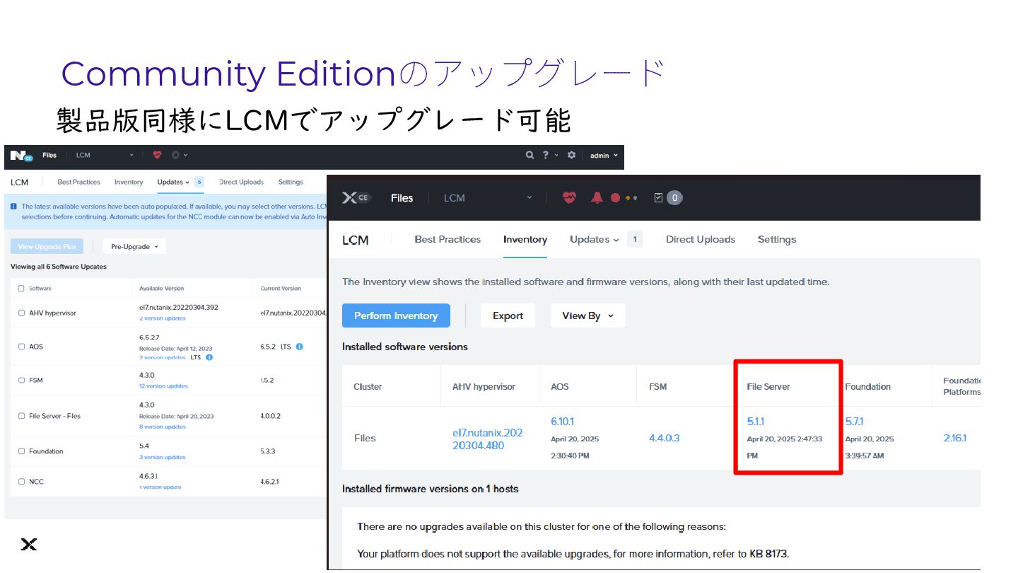 AHV、CVM、Subnet、Default GWのIPアドレスを入力して続行 5. 初期インストール完了まで待ち、画面指示通りにメディアを抜き再起動 6. CVMが起動しきるまで待ち、クラスター作成開始 7. cluster -s cvm_ip --redundancy_factor=1 create (1ノードの場合) 8. WebブラウザからPrism Elementにアクセスしパスワードを作成 9. 設定画面から必要な初期設定を実施(DNS、NTP、仮想ネットワーク、ク ラスター名、クラスターVIP、iSCSI Data IP、etc) 10. Prism Centralをダウンロードしてデプロイ(オプションですが推奨) Nutanix CE 構築 CE2.0 以降の情報を参照