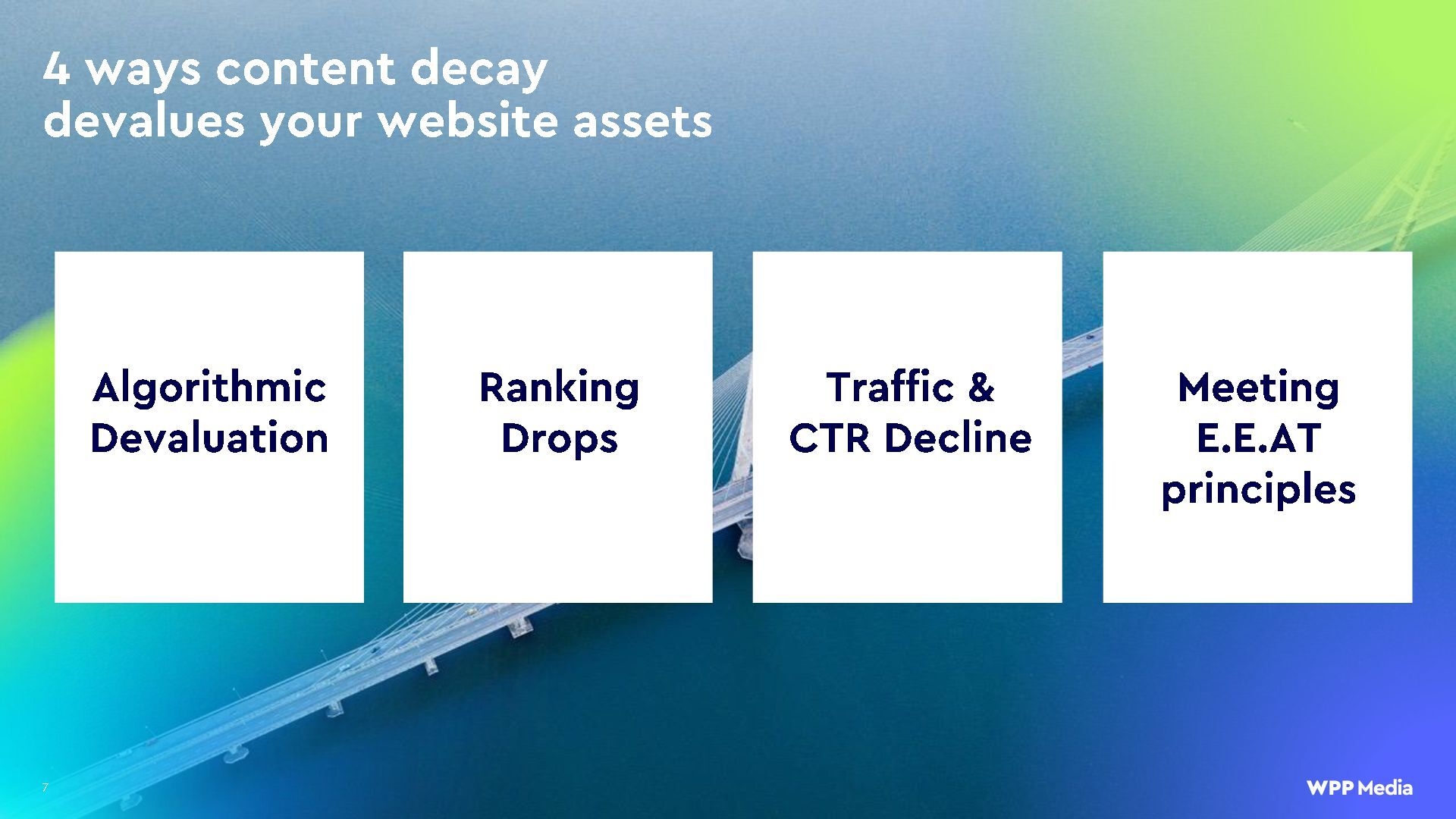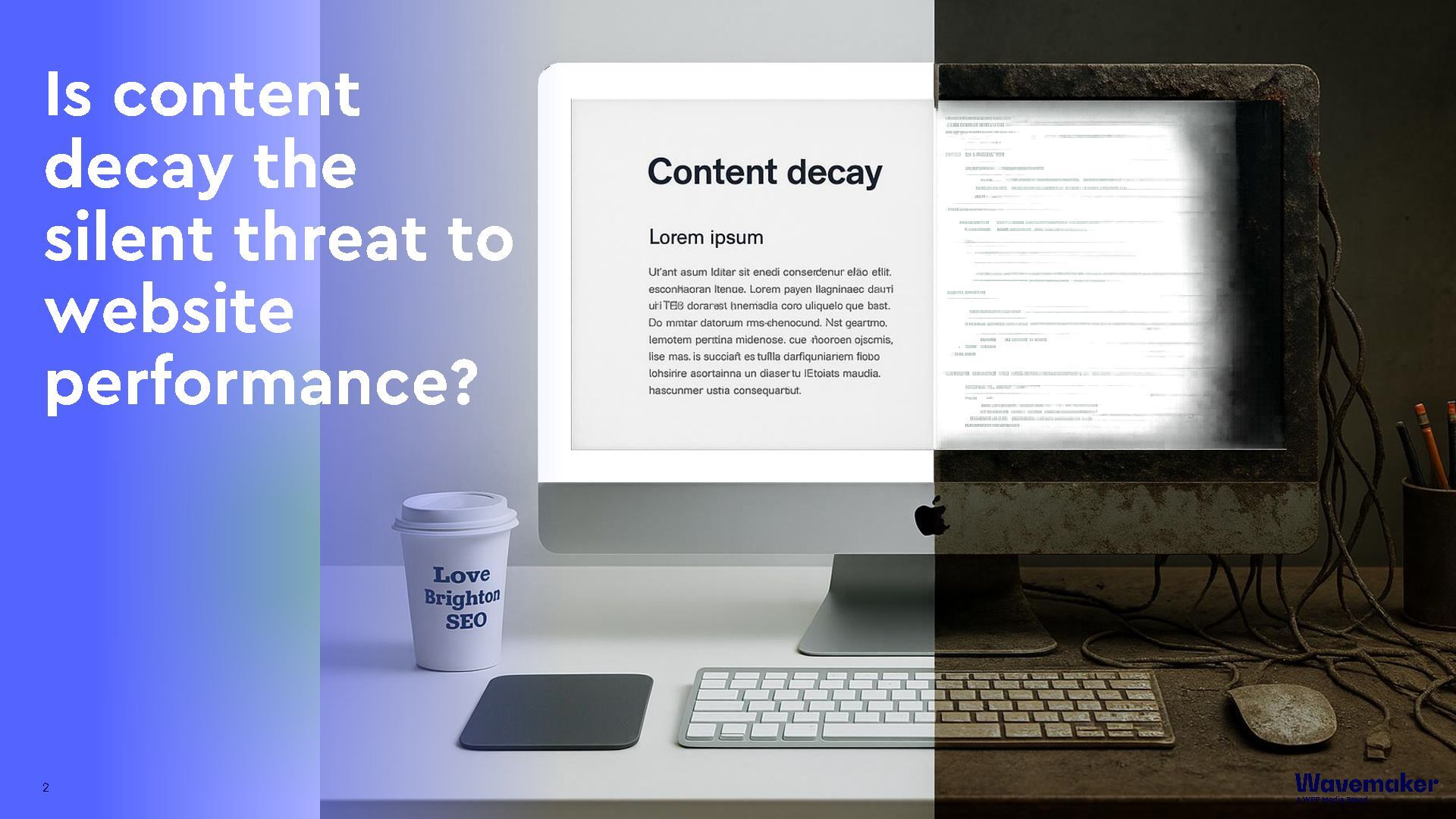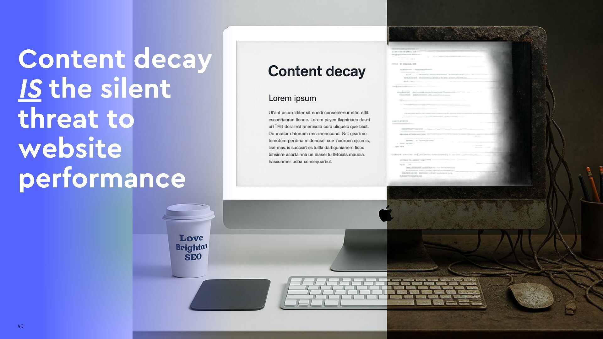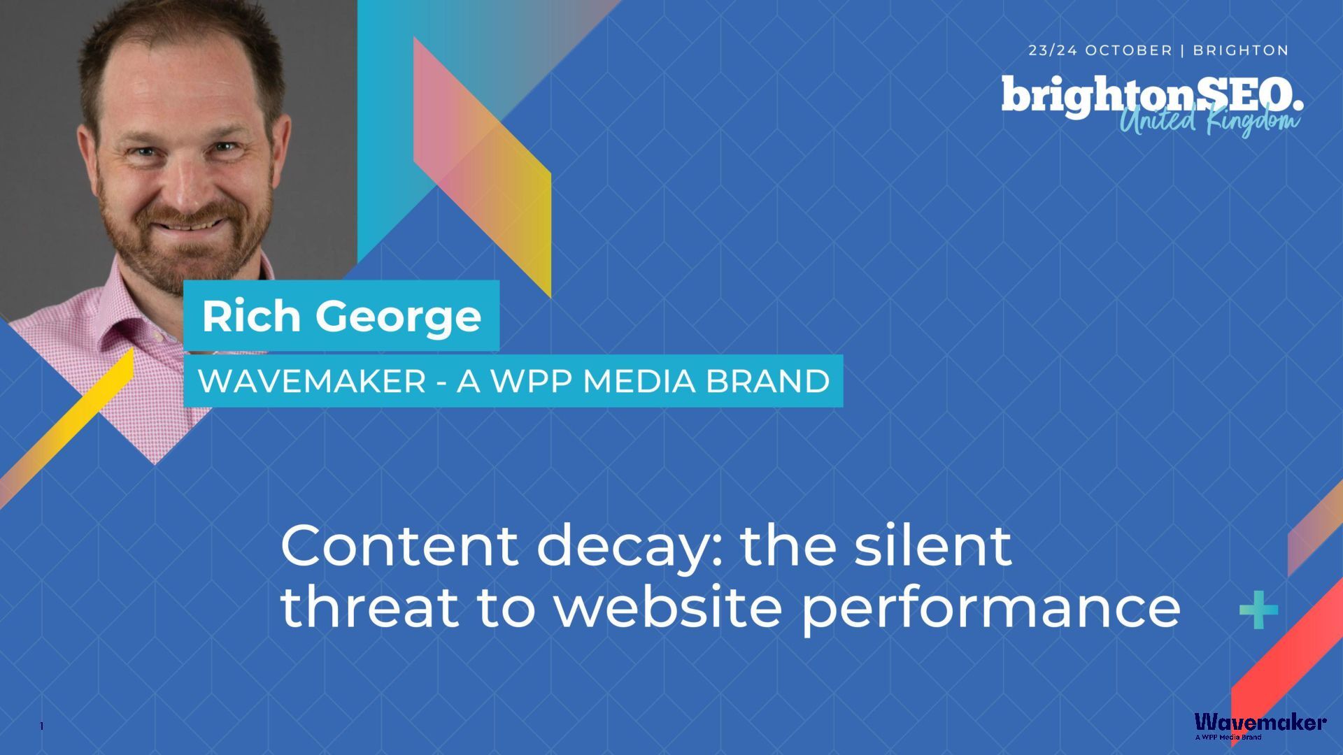 This presentation by Rich George from Wavemaker at Brighton SEO tackles "Content decay: the silent threat to website performance." It defines content decay as the gradual erosion of a webpage's performance, relevance, and accuracy over time, impacting not only SEO but also leading to lost visitors, wasted resources, eroding brand trust, and potentially "corrupting" AI models.