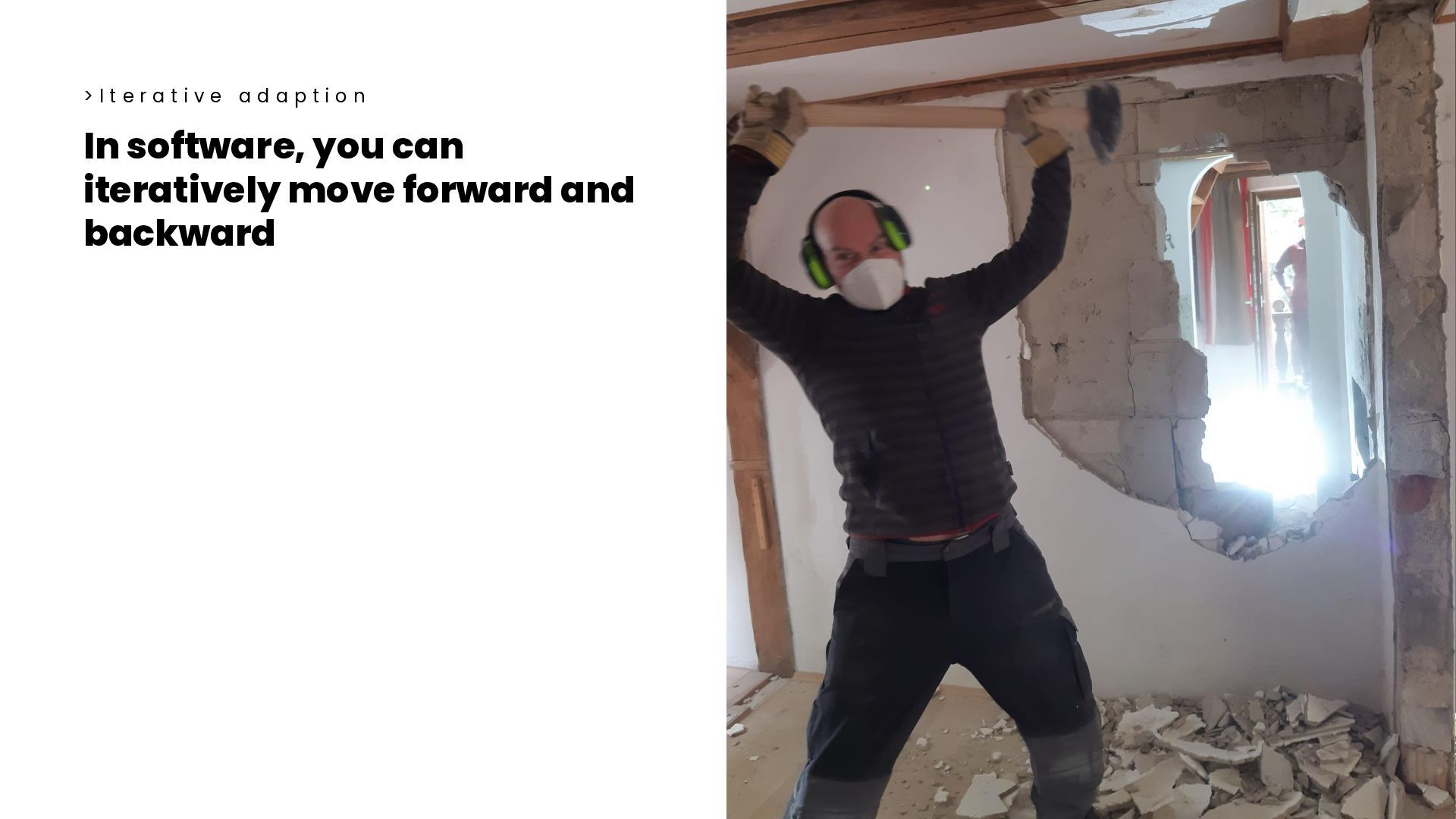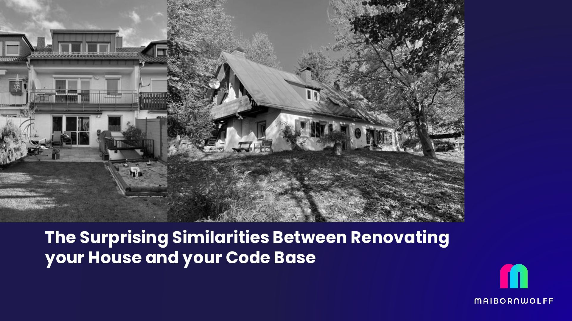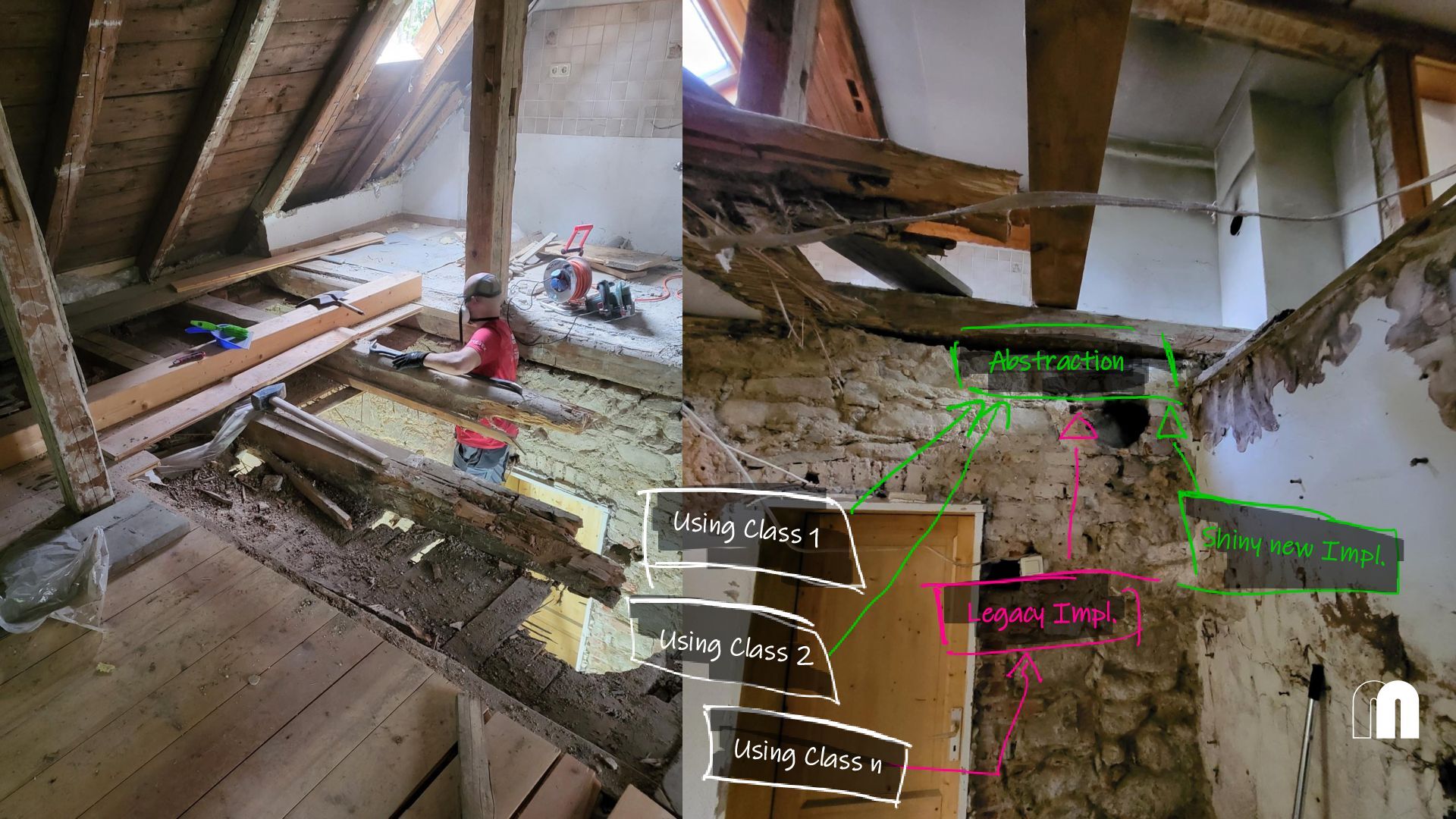 In this experience report I'll show lots of pictures from our house renovation - full of torn down walls, replaced floors and the like - and draw analogies to our legacy code renovation. I'll share helpful tips for code renovation that can be understood by anyone due to the building analogies and hopefully entertain you along the way. By the end I hope to have convinced you that renovating a legacy code base is a much nicer task than renovating a house, where each torn down wall can lead to brick and mortar raining down on your malleable head.