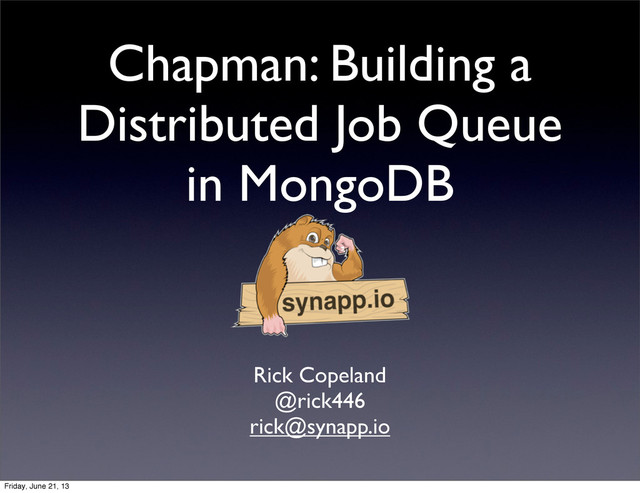 When you're building a web application, you want to respond to every request as quickly as possible. The usual approach is to use an asynchronous job queue like Sidekiq, Resque, Celery, RQ, or a number of other frameworks to handle those tasks outside the request/response cycle in a separate 'worker' process. Unfortunately, many of these frameworks either require the deployment of Redis, RabbitMQ, or some other request broker, or they resort to polling a database for new work to do. Chapman is a distributed task queue built on MongoDB that avoids gratuitous polling, using capped collections and tailable cursors to provide notifications of incoming work. Inspired by Celery, Chapman also supports task graphs, where multiple tasks that depend on each other can be executed by the system asynchronously. Come learn how Synapp.io is using MongoDB and Chapman to handle its core data processing needs.