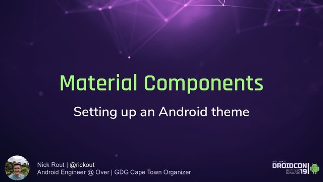 This presentation covers setting up a Material Components theme for Android with the help of a “playground” visual aid. This will include new global theme attributes to customize the three Material Theming subsystems – color, typography and shape – as well as per-widget styles. It will also demonstrate how you can use Material Design tools – Color, Icons, Gallery and the Theme Editor Sketch Plugin – to choose a Material Theme that will make your new/existing app really stand out.