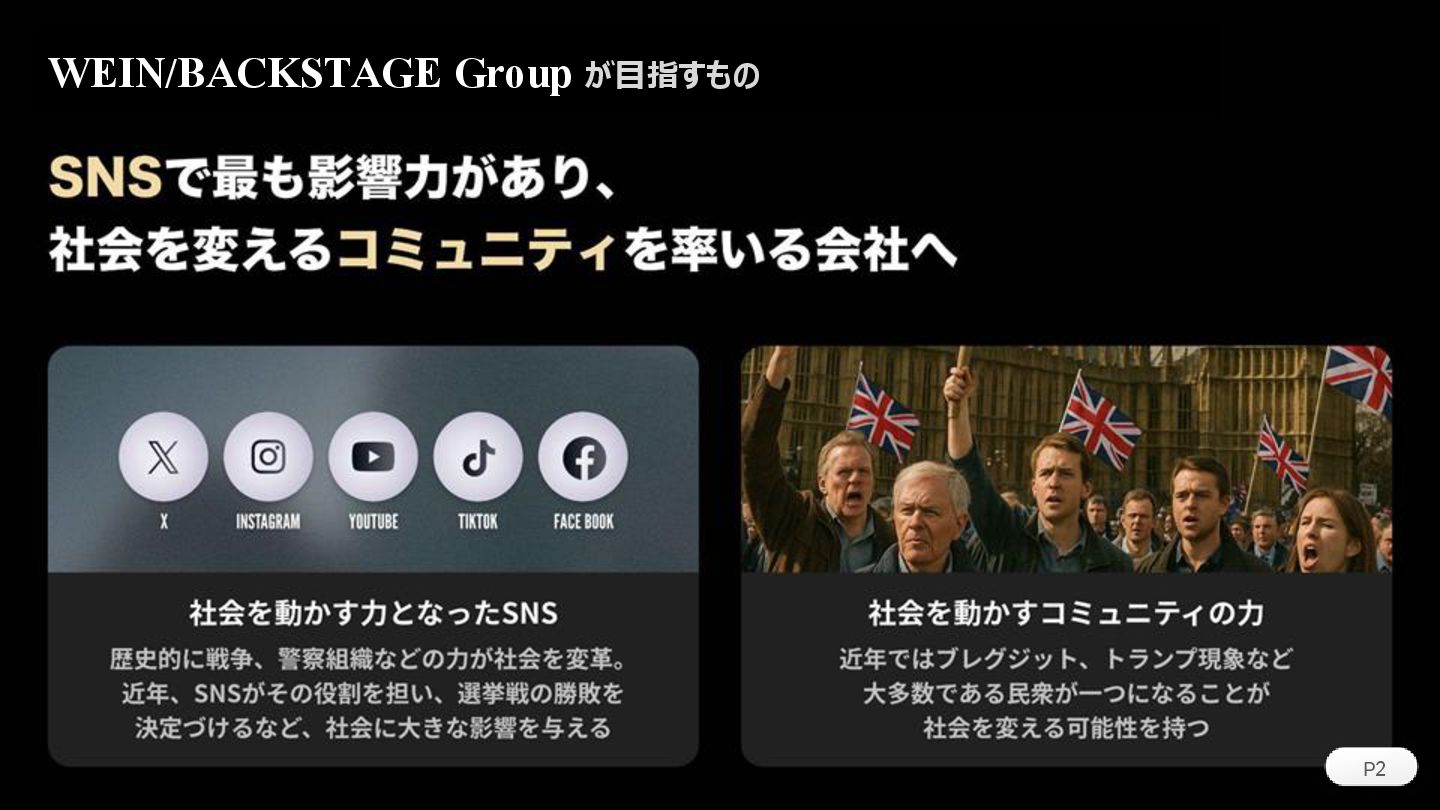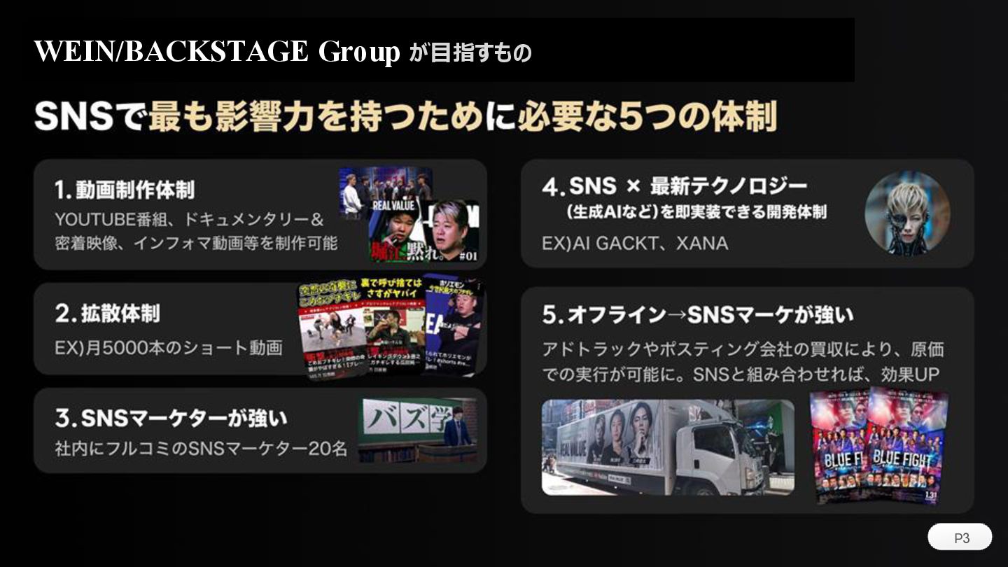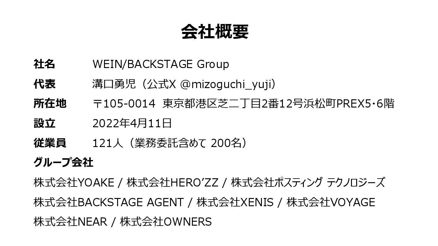 16. 社名 WEIN/BACKSTAGE Group 代表 溝口勇児(公式X @mizoguchi_yuji) 所在地 〒105-0014 東京都港区芝二丁目2番12号浜松町PREX5・6階 設立