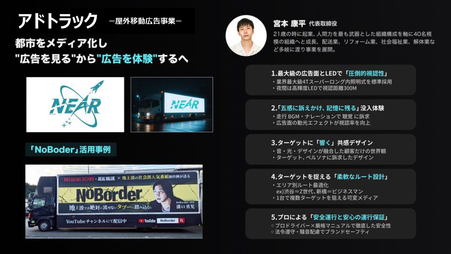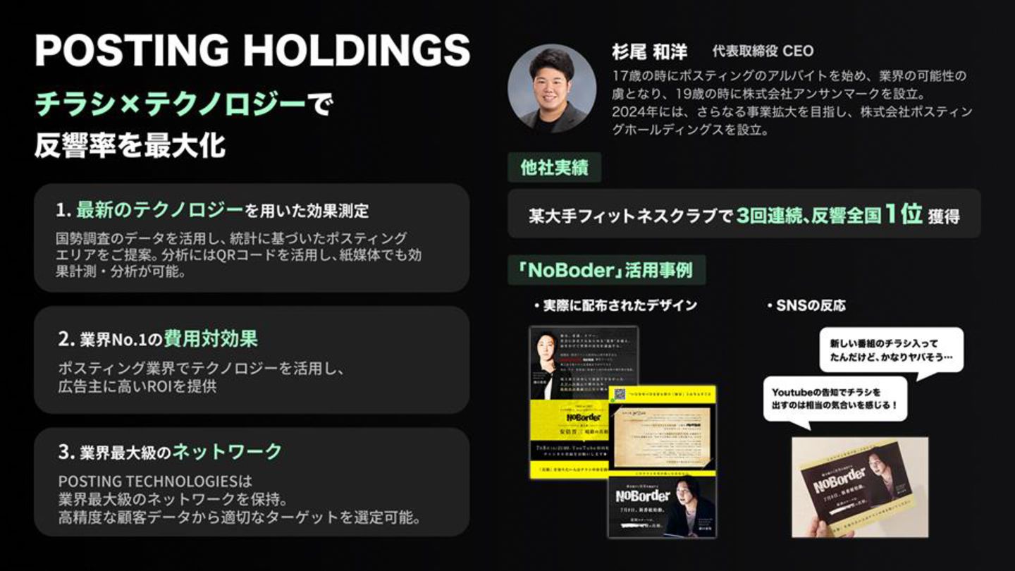 2022年4月11日 従業員 121人(業務委託含めて 200名) グループ会社 株式会社YOAKE / 株式会社HERO’ZZ / 株式会社ポスティング テクノロジーズ 株式会社BACKSTAGE AGENT / 株式会社XENIS / 株式会社VOYAGE 株式会社NEAR / 株式会社OWNERS 会社概要