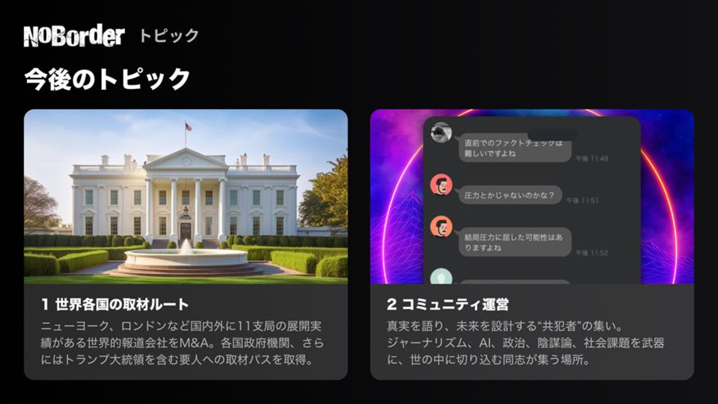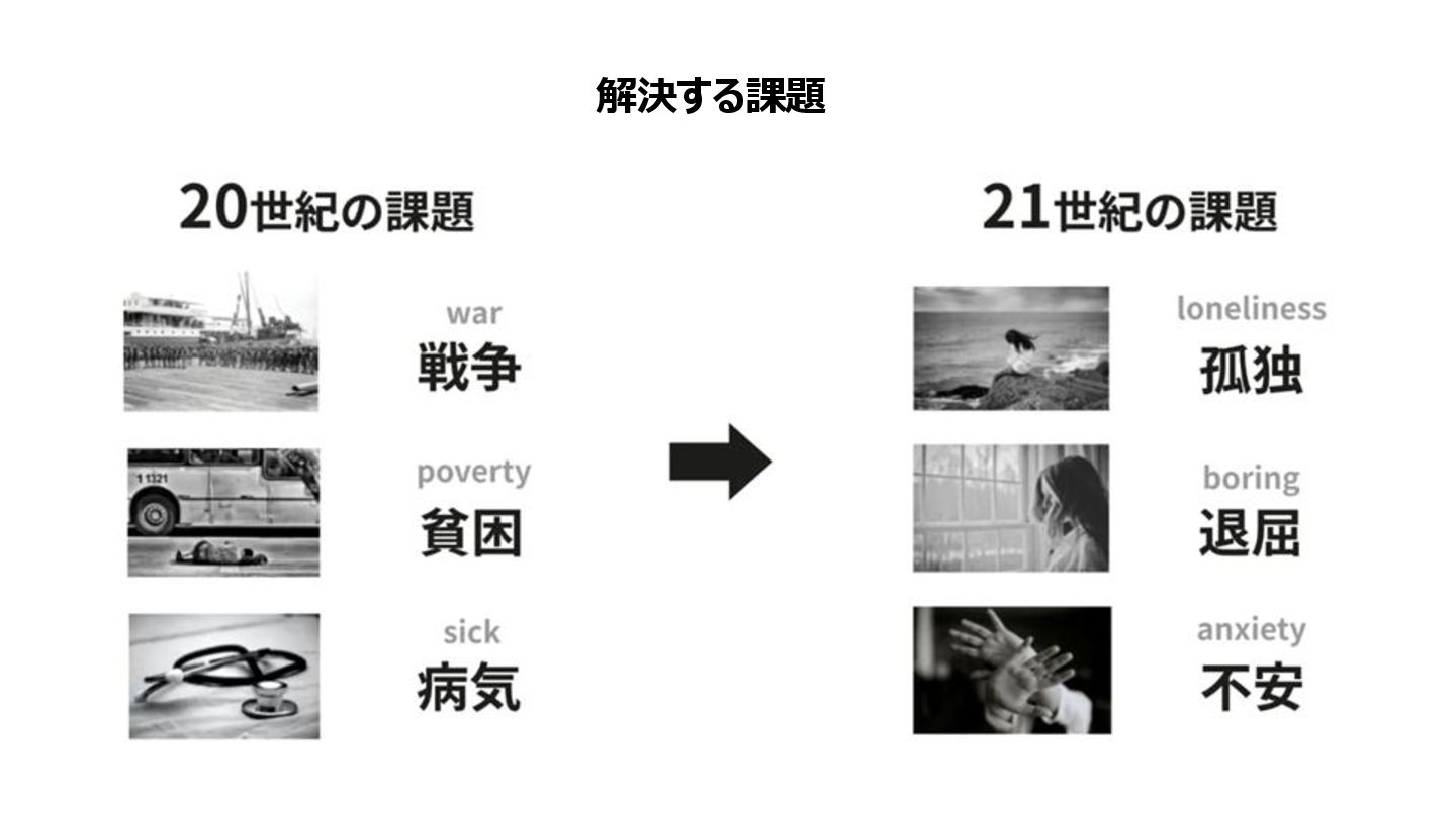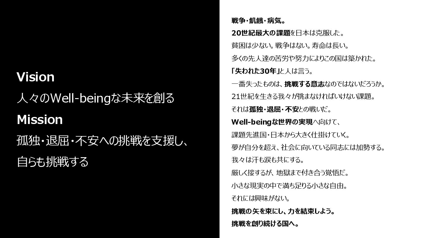 一番失ったものは、挑戦する意志なのではないだろうか。 21世紀を生きる我々が挑まなければいけない課題。 それは孤独・退屈・不安との戦いだ。 Well-beingな世界の実現へ向けて、 課題先進国・日本から大きく仕掛けていく。 夢が自分を超え、社会に向いている同志には加勢する。 我々は汗も涙も共にする。 厳しく接するが、地獄まで付き合う覚悟だ。 小さな現実の中で満ち足りる小さな自由。 それには興味がない。 挑戦の矢を束にし、力を結束しよう。 挑戦を創り続ける国へ。