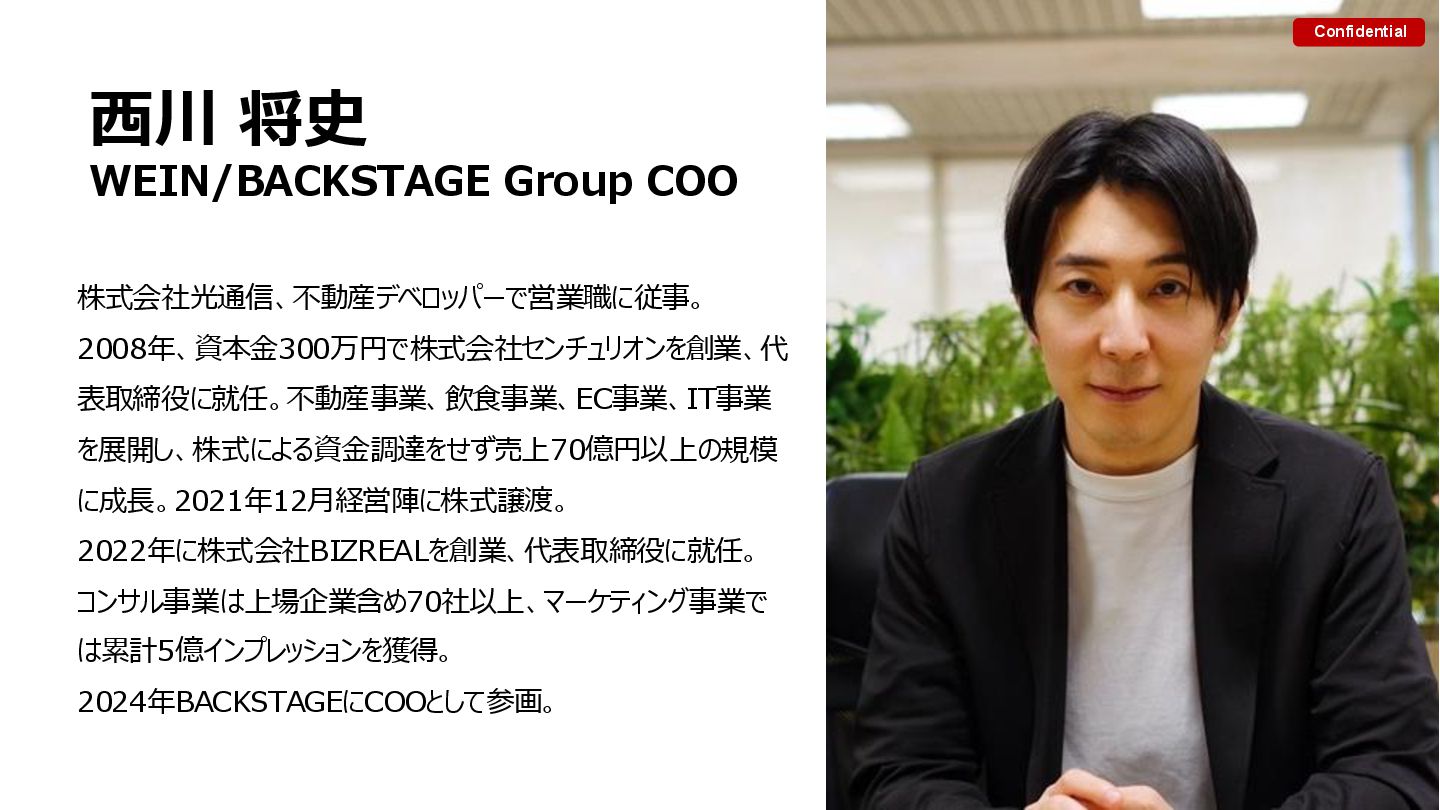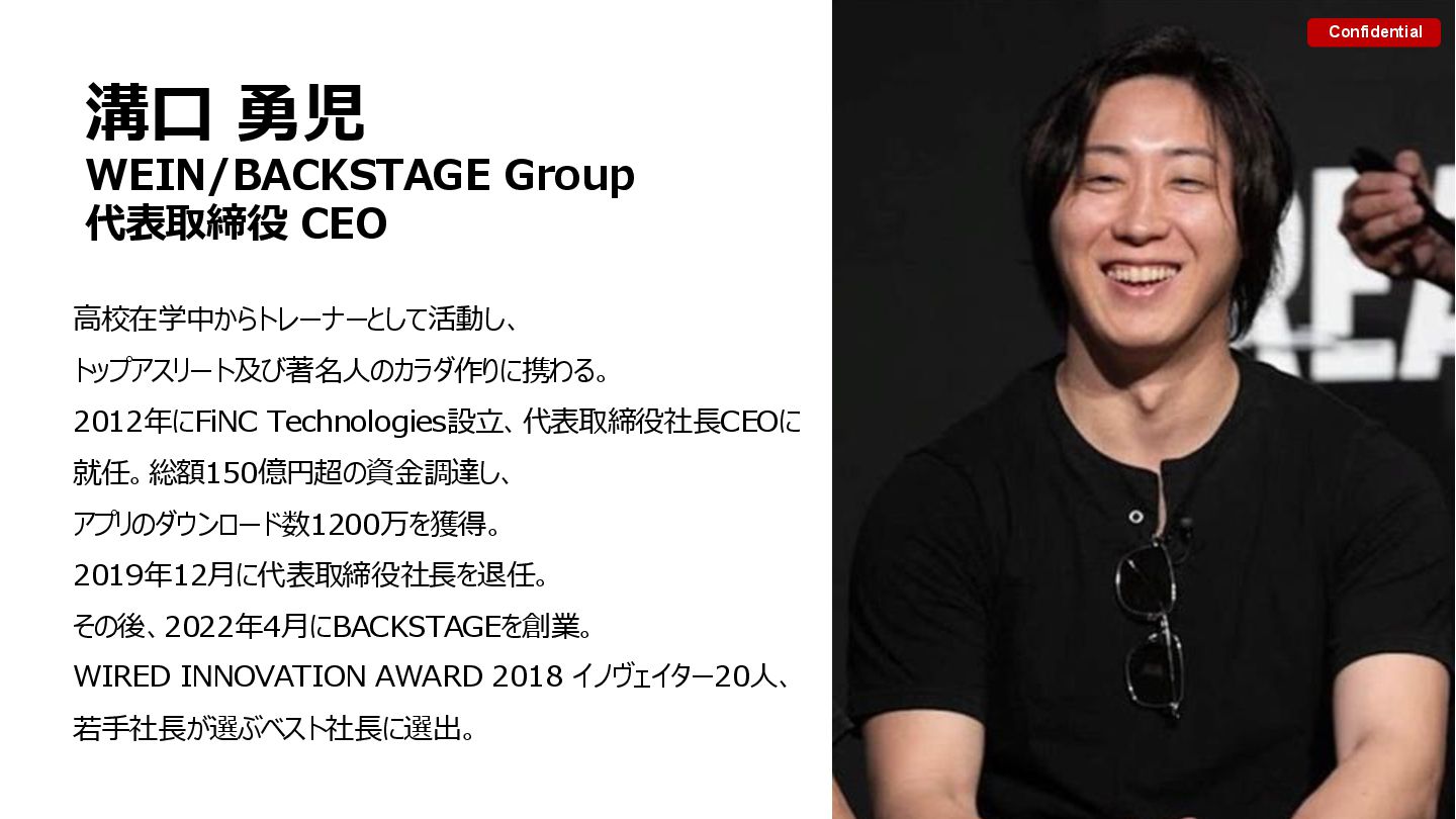 就任。総額150億円超の資金調達し、 アプリのダウンロード数1200万を獲得。 2019年12月に代表取締役社長を退任。 その後、2022年4月にBACKSTAGEを創業。 WIRED INNOVATION AWARD 2018 イノヴェイター20人、 若手社長が選ぶベスト社長に選出。 Confidential