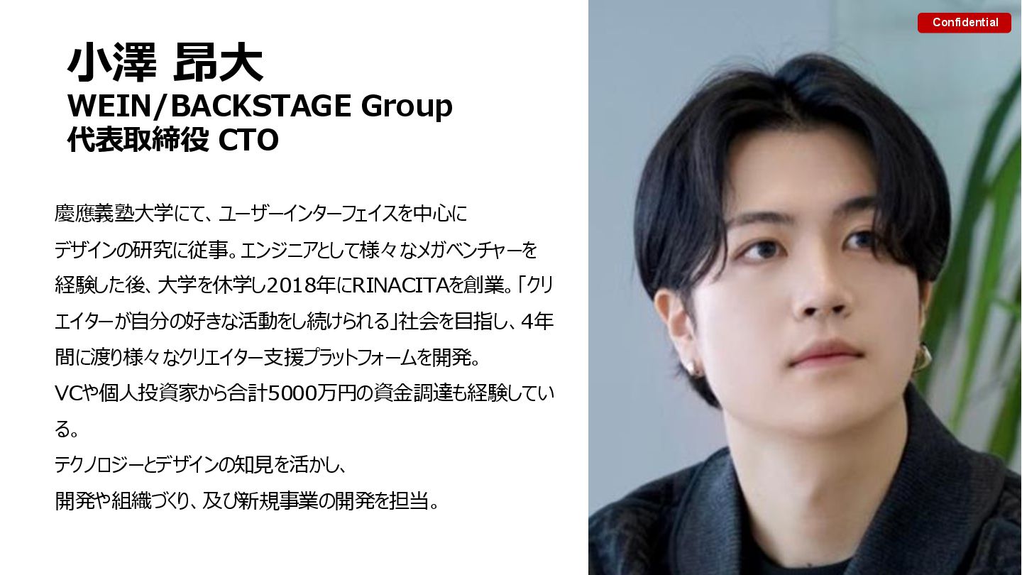 間に渡り様々なクリエイター支援プラットフォームを開発。 VCや個人投資家から合計5000万円の資金調達も経験してい る。 テクノロジーとデザインの知見を活かし、 開発や組織づくり、及び新規事業の開発を担当。 Confidential
